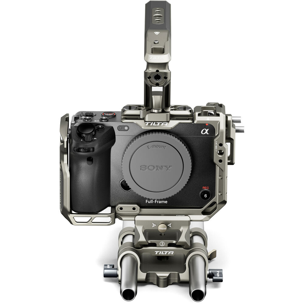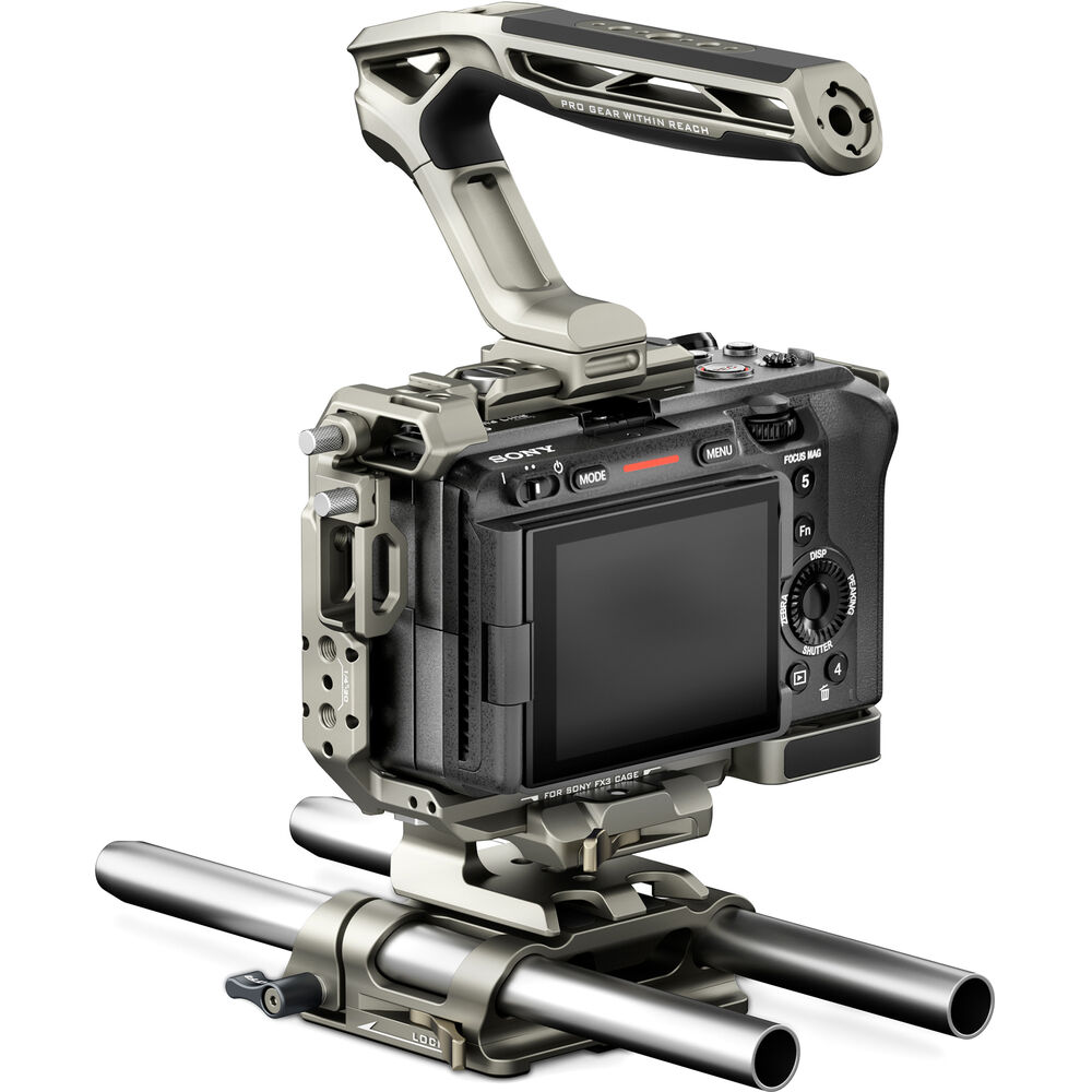 Add protection and accessories for handheld shots to your Sony FX3 or FX30 digital cinema camera with this titanium gray Camera Cage Basic Kit v2 from Tilta. This kit includes a full cage for the FX3/FX30, a NATO top handle, a 15mm LWS baseplate with adapter, and two 7.8" long 15mm rods.