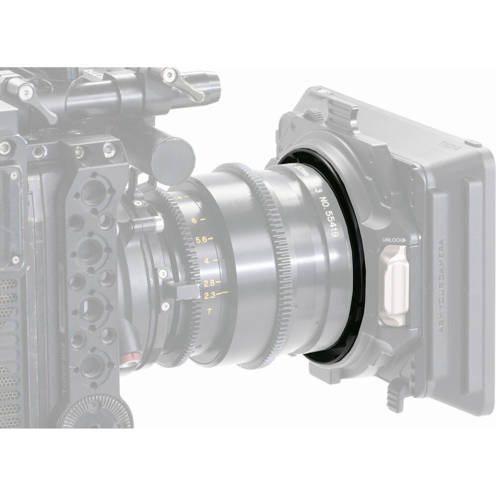 This adapter ring clamps around the front of your 80mm lens for a secure fit, then slides precisely into the rear opening of the Tilta Mirage.