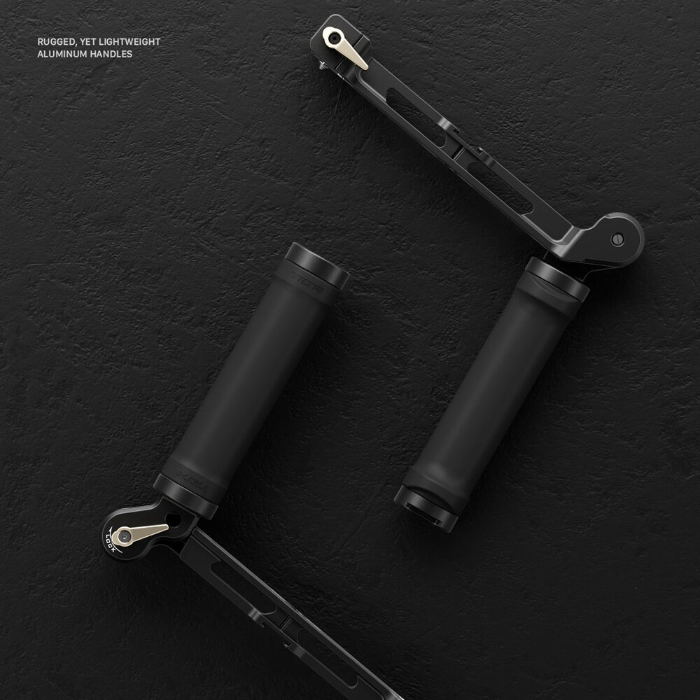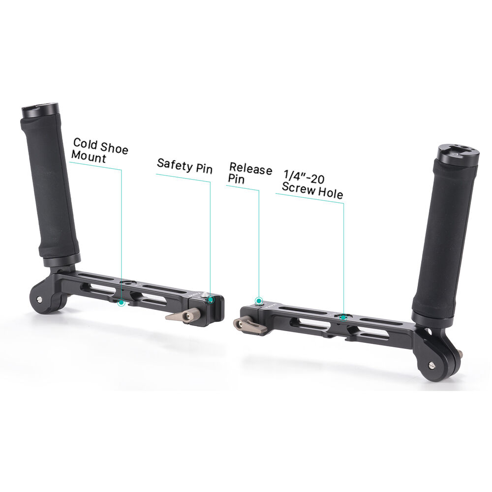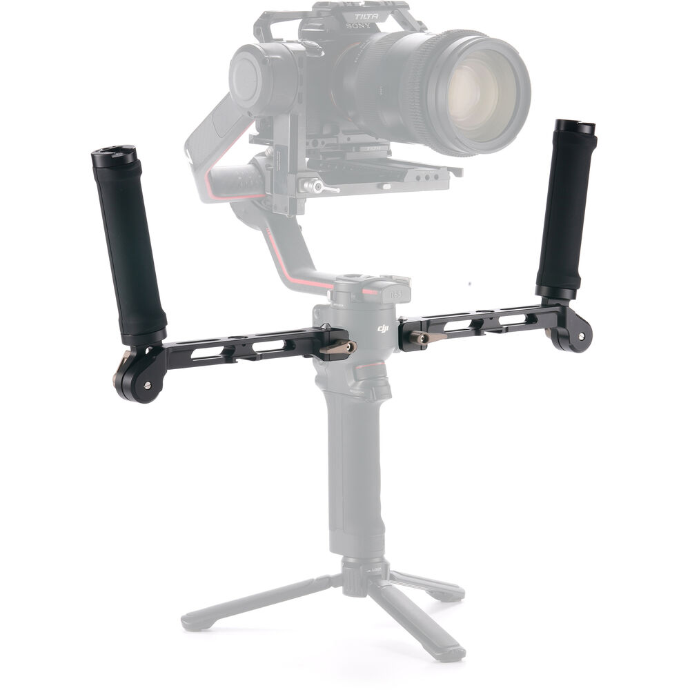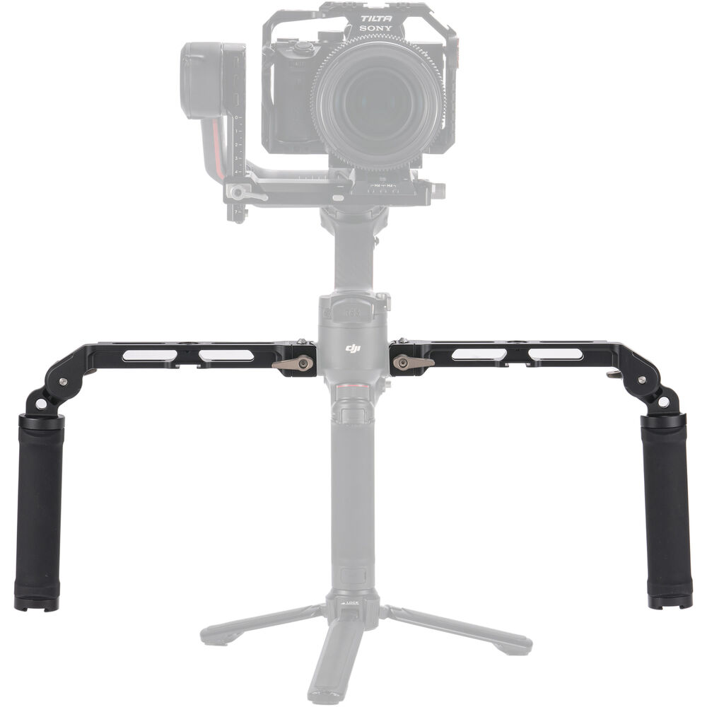 Comfortably support your RS 2, RSC 2, RS 3, or RS 3 Pro gimbal using both hands and the Dual-Handle Bracket for DJI Ronin from Tilta. Made of lightweight yet durable aluminum, each flexible handle features a rotatable folding design, a shoe mount, and anti-twist 1/4"-20 and 3/8"-16 accessory threads.