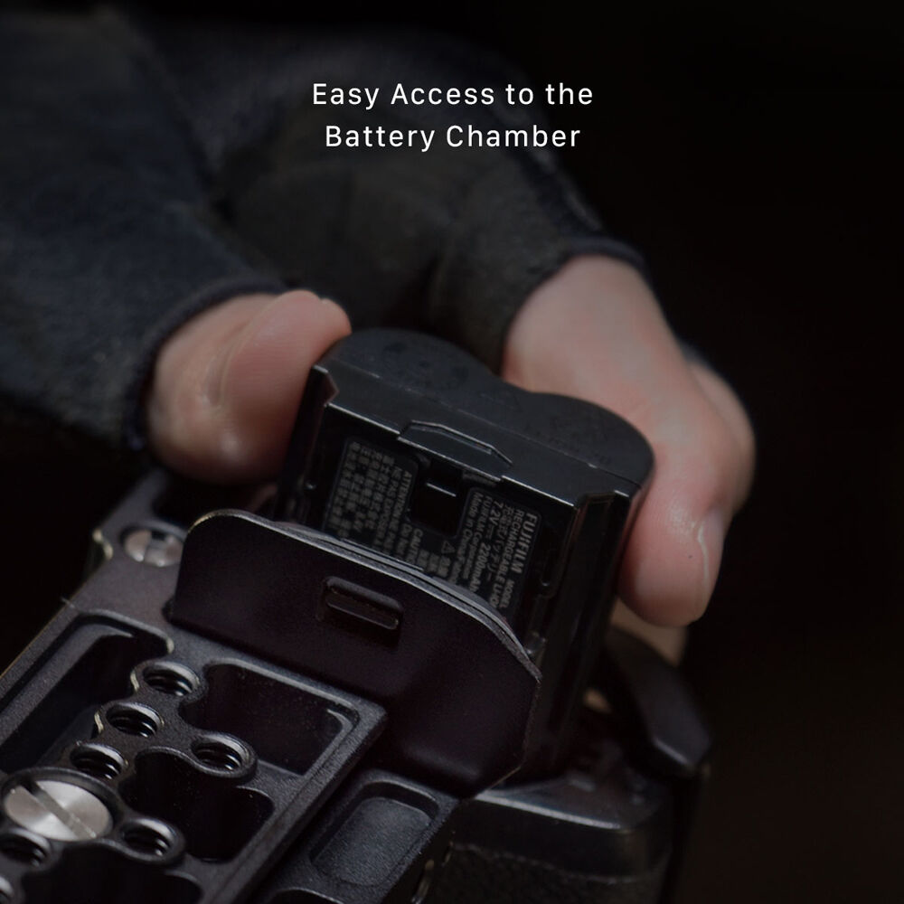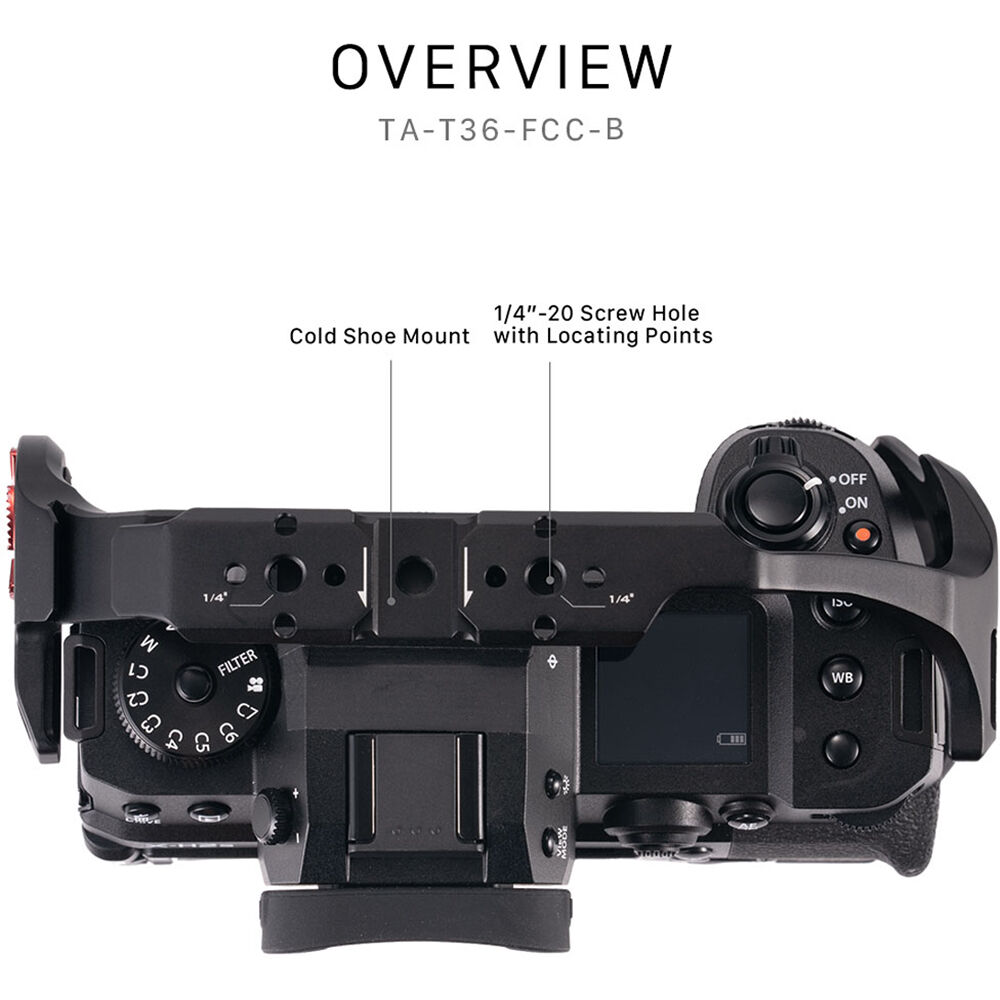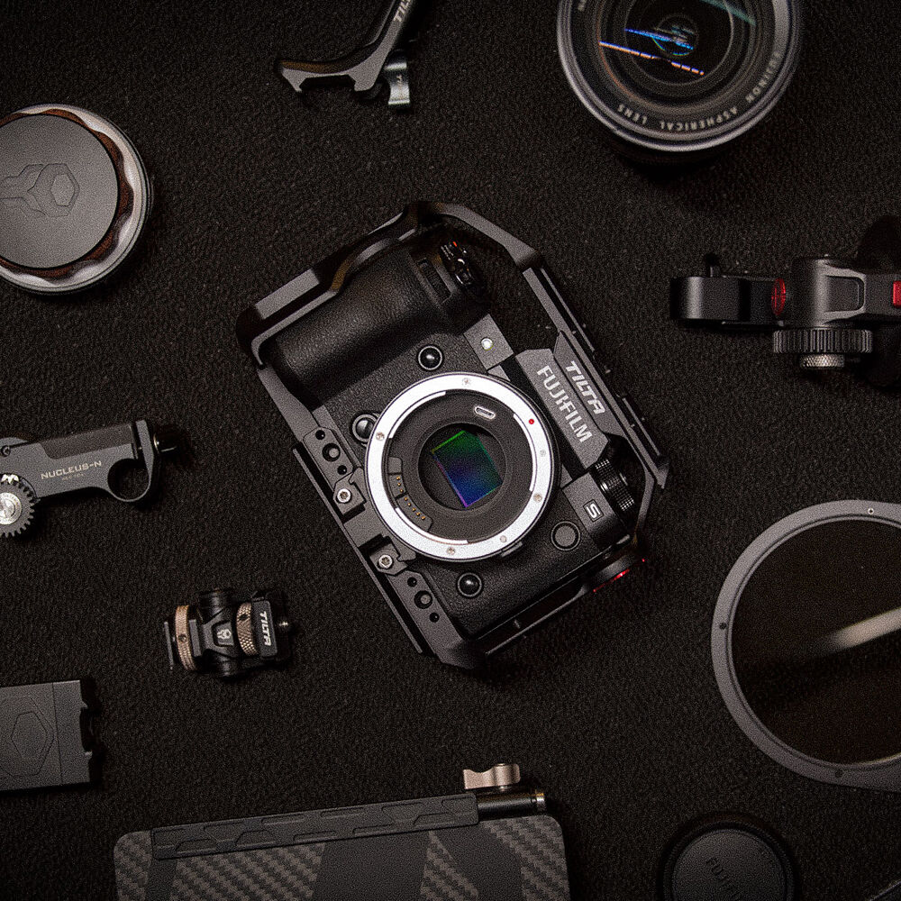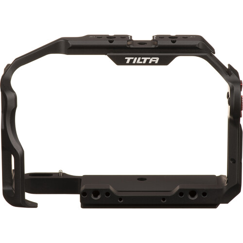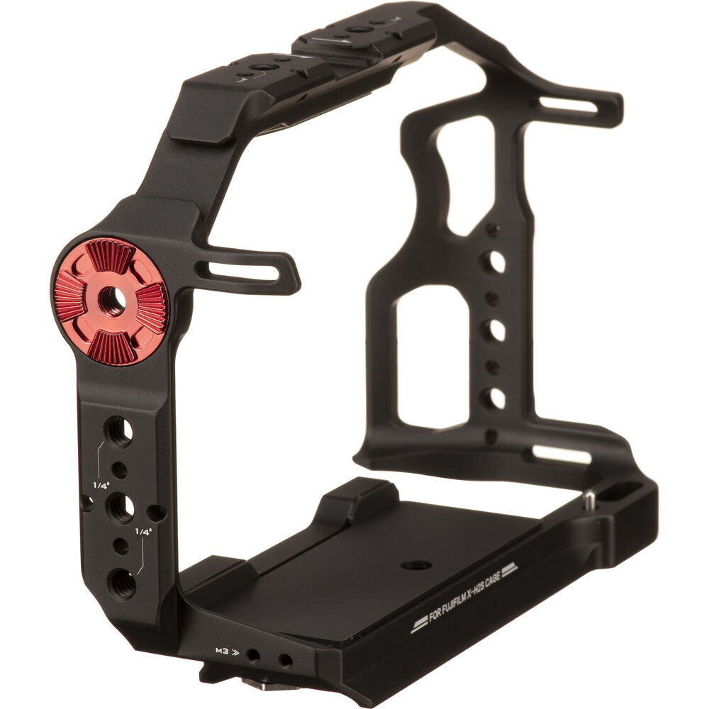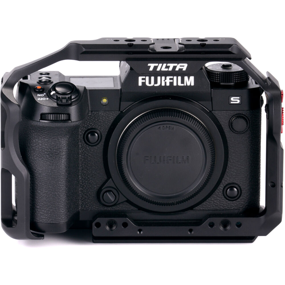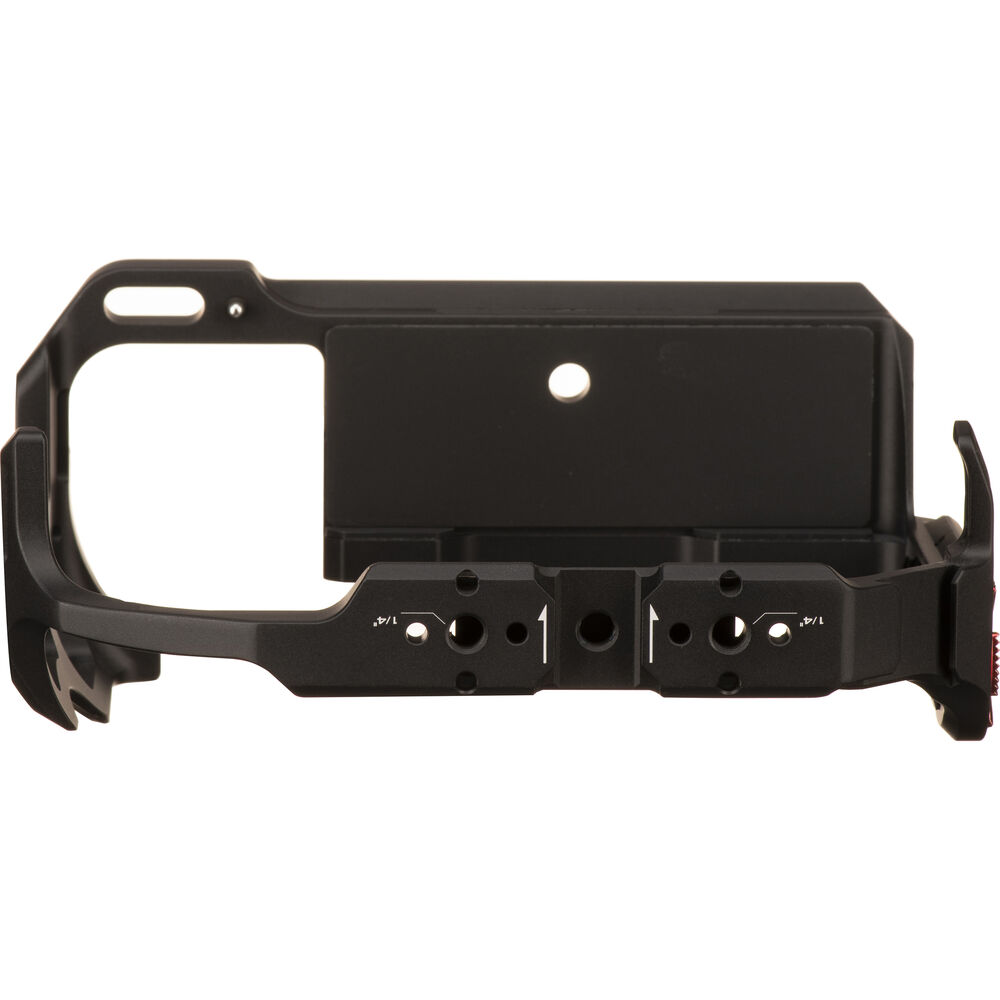 This black Full Camera Cage from Tilta is a formfitting aluminum cage that protects your FUJIFILM X-H2S or X-H2 mirrorless camera during production without impeding access to your camera's functions, displays, ports, or battery. The camera is secured in the cage using a 1/4"-20 mounting screw.