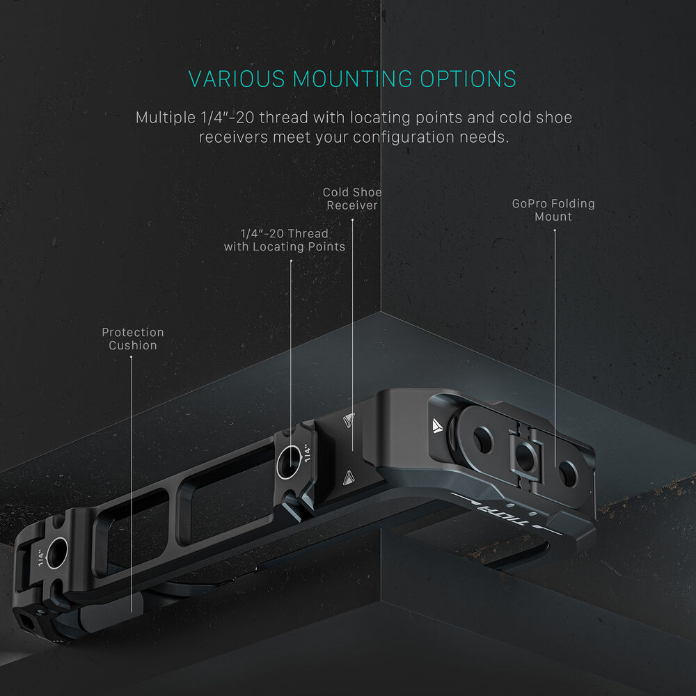 The cage has one integrated shoe mount and two 1/4"-20 threads that enable you to quickly add a light, microphone, or another accessory. The 1/4"-20 threads also feature anti-twist locating divots. It can be mounted on a tripod or handheld gear using the GoPro-style "Folding Fingers" two-prong mount or a 1/4"-20 thread.