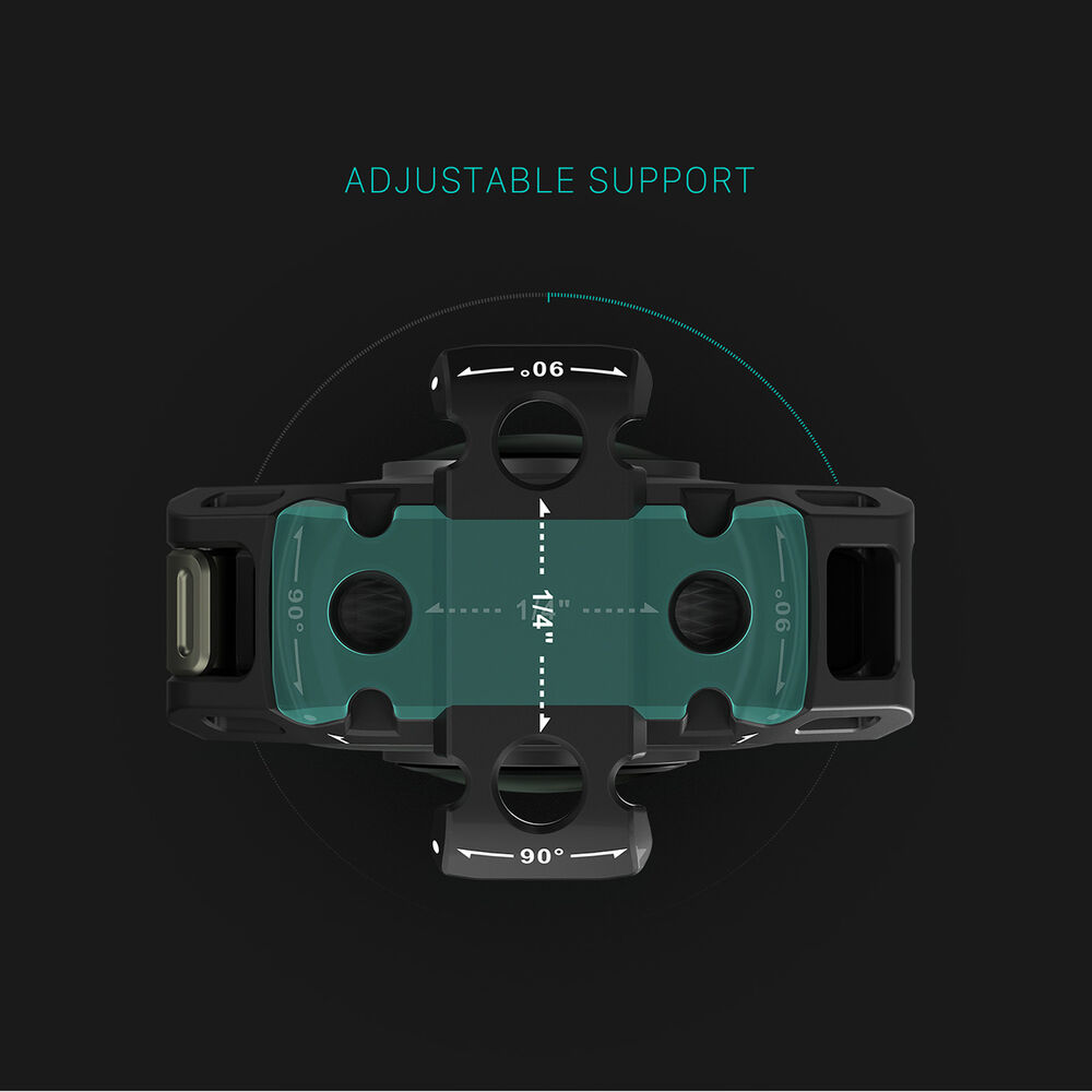 Mounts on a tripod or another support via a GoPro-style "Folding Fingers" mount or via a 1/4"-20 thread