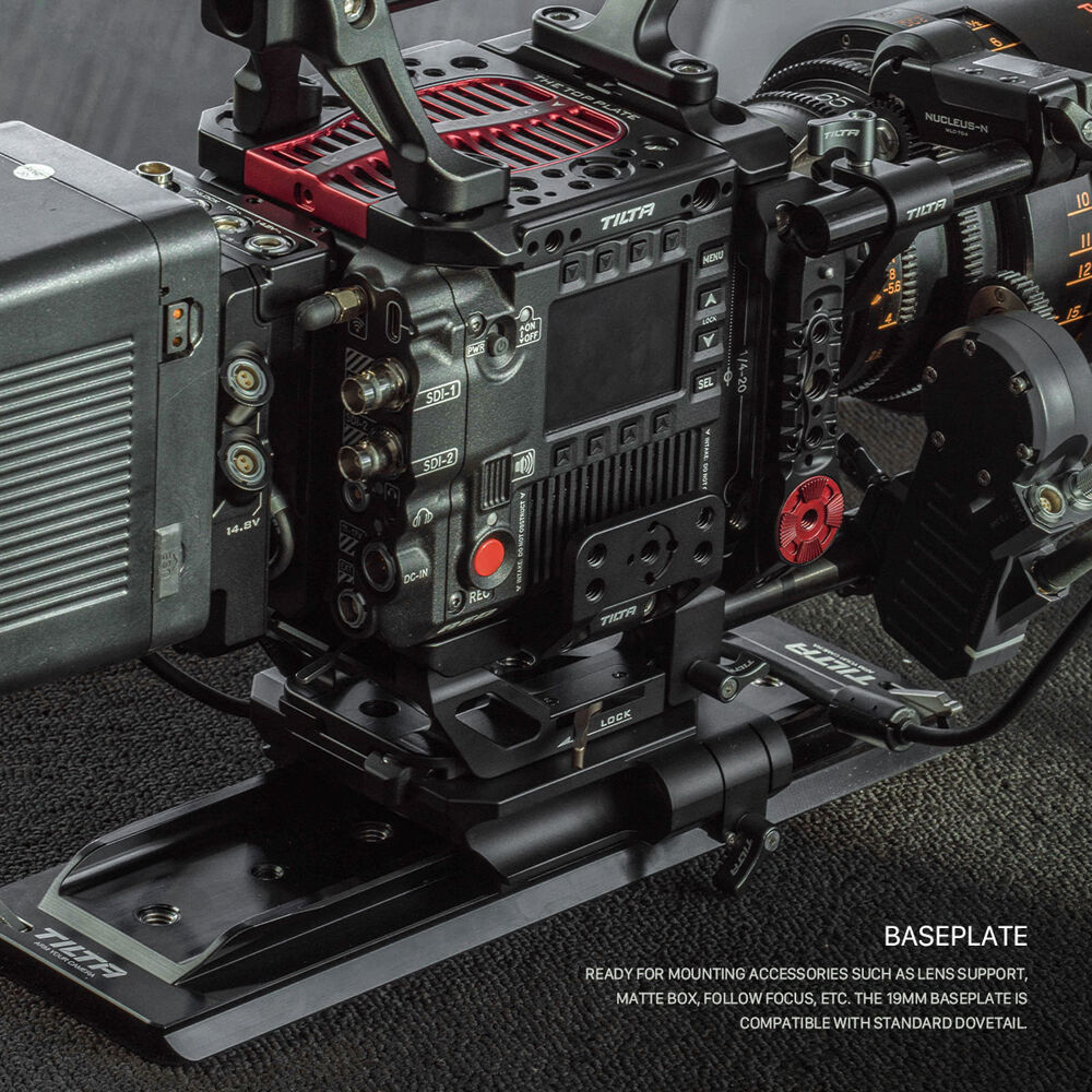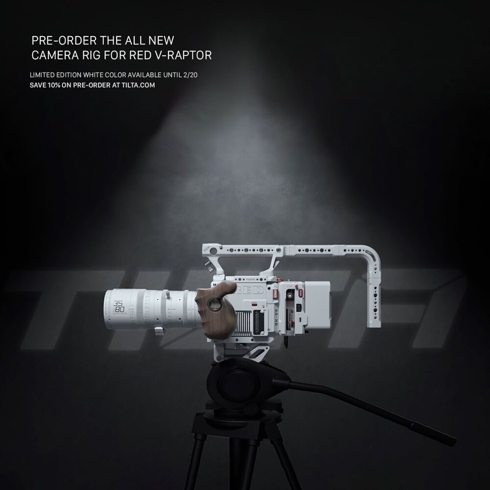 Outfit your RED V-RAPTOR with the Tilta Full Camera Cage to increase its accessory mounting capabilities while maintaining access to its controls. Multiple 1/4"-20 and 3/8"-16 threads are positioned all over the cage to mount articulating arms or secondary monitors onto your RED V-RAPTOR. A front top plate attaches right above the lens of the camera and provides a built-in cold shoe adapter for the addition of shotgun microphones, among other accessories, to your gear configuration.