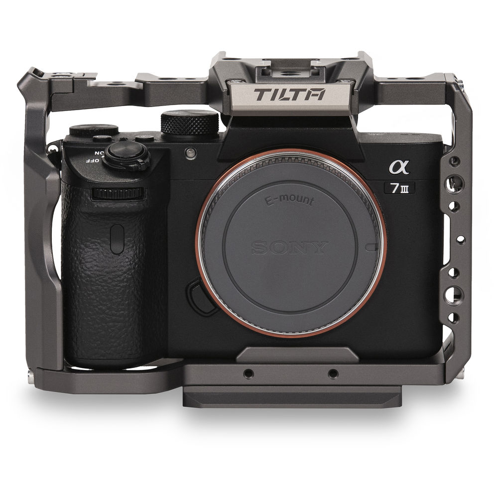 Featuring a Tilta Gray finish, the Tilta Full Camera Cage for Sony a7/a9 Series is an easily assembled formfitting cage that holds your camera securely and features multiple 1/4"-20 threaded mounting holes for accessories. Two cold shoes also allow the mounting of accessories, providing a sturdy frame that won't stress your camera's body. The bottom plate features multiple mounting holes for attaching to a tripod or gimbal. The multiple holes allow you to fine-tune the position of your camera on your gimbal for more balancing options.