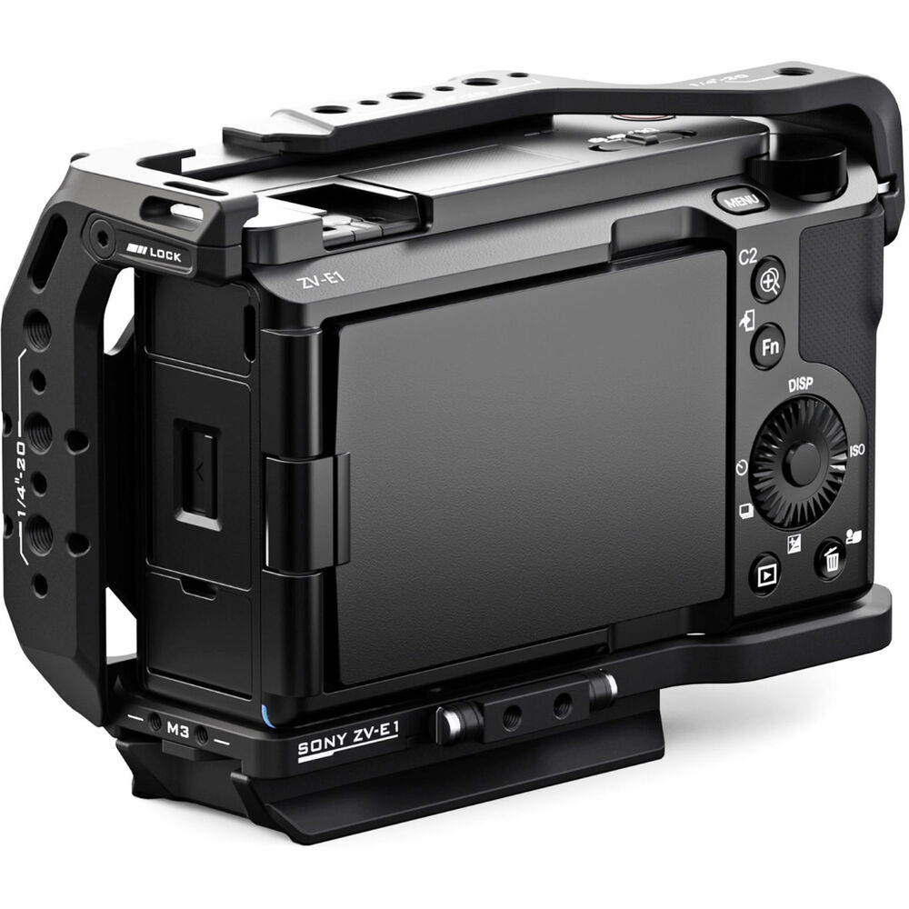 Designed to fit your Sony ZV-E1, this black Tilta Full Camera Cage offers multiple mounting points, additional protection, and both portrait and landscape shooting, all in one cage design. Included with the cage is an Arca-type plate which can be attached to either the bottom or the side to support native switching between horizontal and vertical shooting orientations. The cage maintains access to the camera's ports and controls while adding multiple 1/4"-20 anti-twist threads throughout to attach additional accessories.