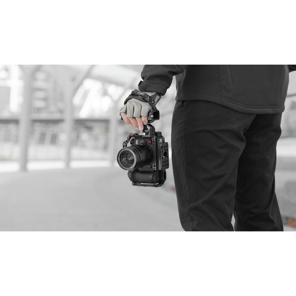 To build out your GH6 rig, lock it within the rock-solid skeletal core of the black, professional edition of the Full Camera Cage Kit for Panasonic GH6. In addition to the top handle for capturing low-angle shots and an HDMI clamp to secure your cables in place, it features a number of accessories like a powered run/stop handle, a quick release baseplate, and 15mm rods to mount a matte box or follow focus.