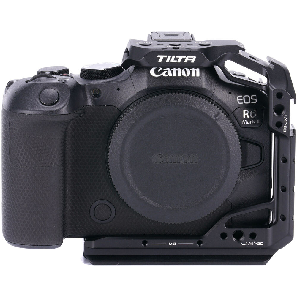 Protect and add accessories to your Canon R6 Mark II mirrorless camera with the lightweight black Half Camera Cage from Tilta. The aluminum and stainless steel cage maintains access to the camera's controls while offering protection and accessory mounting. Use the half cage to attach accessories such as a light, monitor, microphone, or handle using the integrated top shoe mount, side NATO rail, and multiple anti-twist 1/4"-20 mounting threads. The Canon R6 Mark II half cage also features an Arca-type plate on the bottom and a detachable HDMI/USB-C cable clamp.