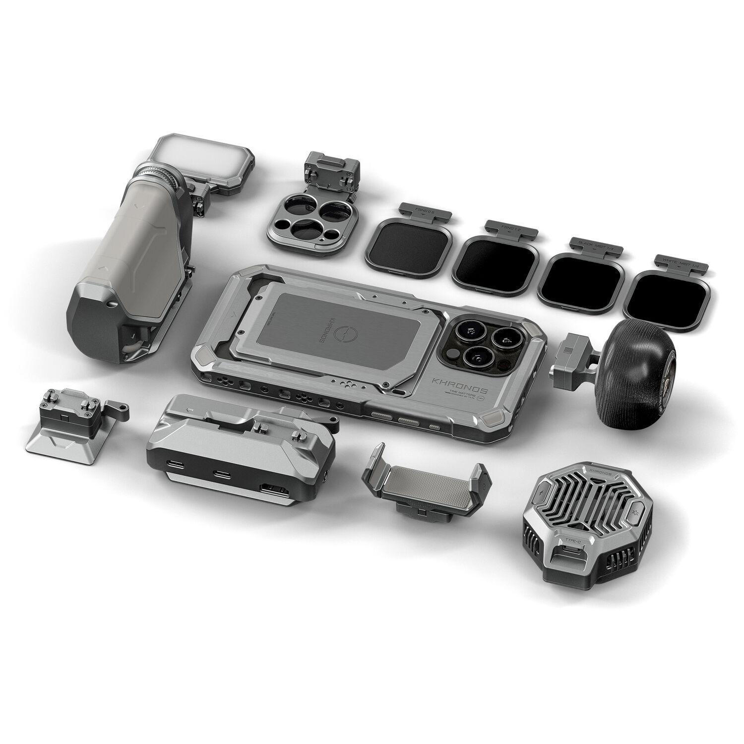 Designed for mobile filmmakers using the iPhone 15 Pro Max, the titanium white Khronos Ultimate Kit from Tilta includes a Khronos iPhone 15 Pro Max Case, a Khronos Cooling System, a Khronos Focus PD Handle, a Khronos Mini Daylight LED Light Panel, a Khronos ARCA Quick Release Adapter (38mm), a Khronos Quick Release USB-C Hub, a Khronos Circular Wooden Handle, a Khronos Universal SSD Holder, a Khronos Quick Release Filter Tray, a Khronos Magnetic FSND 0.6 Filter, a Khronos Magnetic FSND 1.2 Filter, a Khronos Magnetic Black Mist 1/4 Filter, and a Khronos Magnetic White Mist 1/4 Filter. This bundle helps ensure you're better equipped for professional videography, live streaming, vlogging, and more.