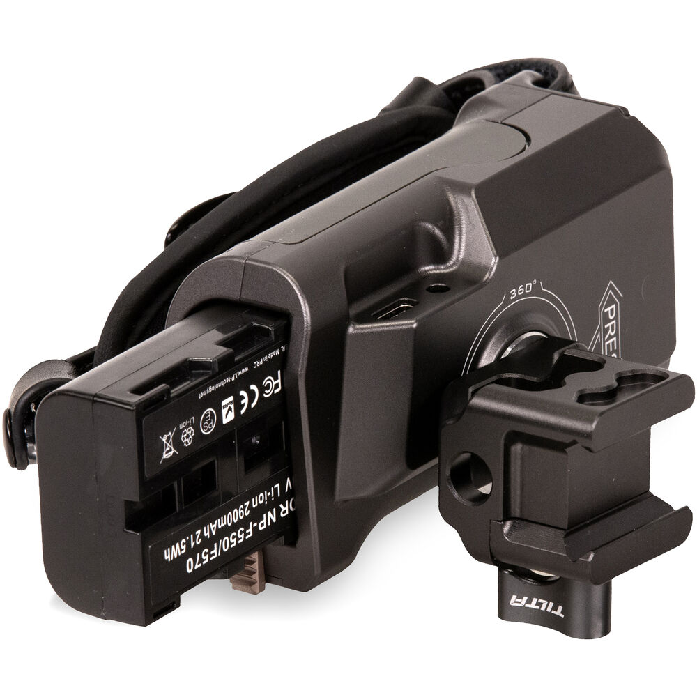 The handle attaches to the side of your Tiltaing cage using the included mounting arm, which features a NATO rail clamp. The handle accepts a Sony F570 battery, sold separately. There are two connections on the handle for powering accessories: an 8V regulated USB Type-C output and a 12 VDC output.
