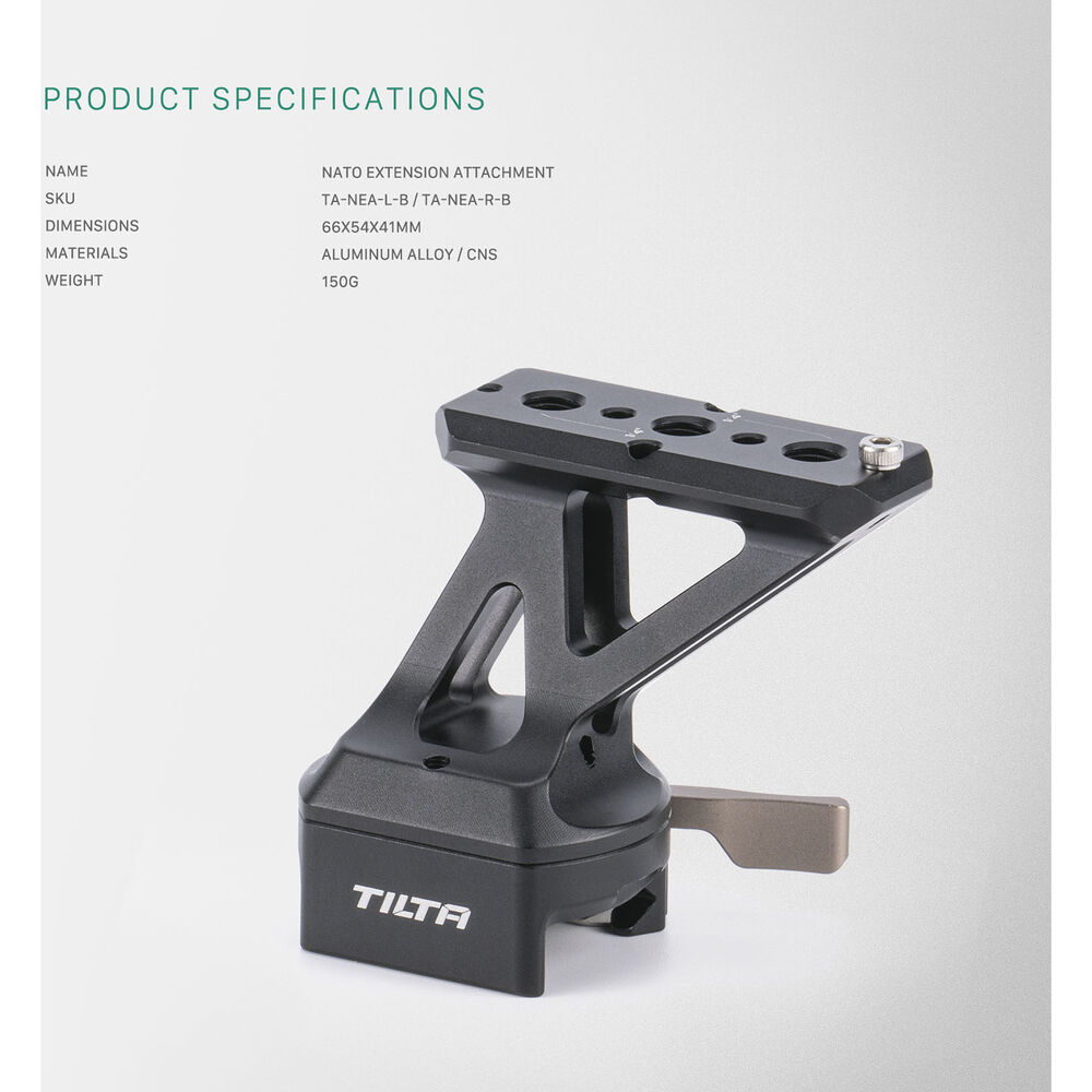 Extend your NATO rail connection to accommodate your camera's flip out LCD screen using this Tilta Left-Side NATO Rail Extension. One side of the extension is a NATO clamp which attaches to your camera cage and the other side boasts a NATO rail to attach compatible side handles. Its aluminum alloy and stainless steel construction creates a durable and lightweight device.