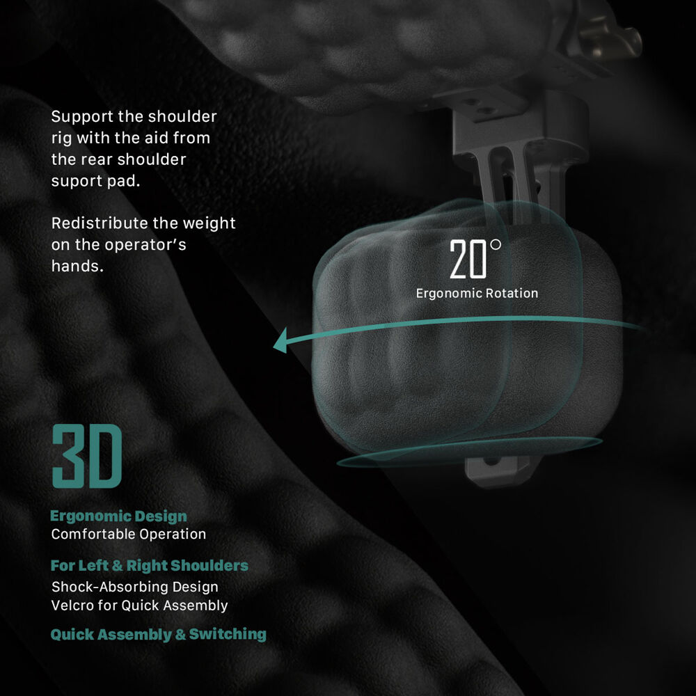 Multiple 1/4"-20 threads, a NATO rail, and 15mm LWS rod mount allow you to attach additional accessories such as articulating arms, counterweights, or battery plates to the rig. Included in the shoulder rig's configuration are dual handgrips and a shoulder pad, which are all adjustable for optimal balance and comfort. Rosette arms offer fine adjustment of the length and angle of said hand grips for even more comfort and operational accuracy.