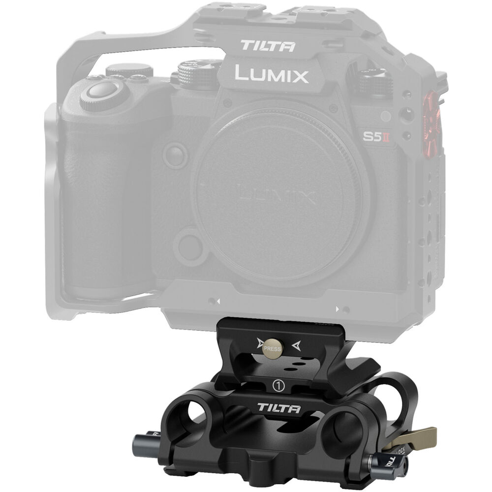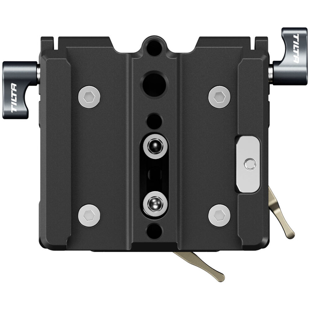 The main baseplate features two 1/4"-20 threads to attach to a tripod or camera cage. It is compatible with Tilta standard Dovetails and other quick release plates using the 1/4"-20 and 3/8"-16 threads on the bottom. Aluminum and steel make up the baseplate's construction for a lightweight and durable mounting device.
