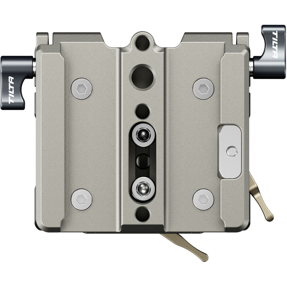 The main baseplate features two 1/4"-20 threads to attach to a tripod or camera cage. It is compatible with Tilta standard Dovetails and other quick release plates using the 1/4"-20 and 3/8"-16 threads on the bottom. Aluminum and steel make up the baseplate's construction for a lightweight and durable mounting device.