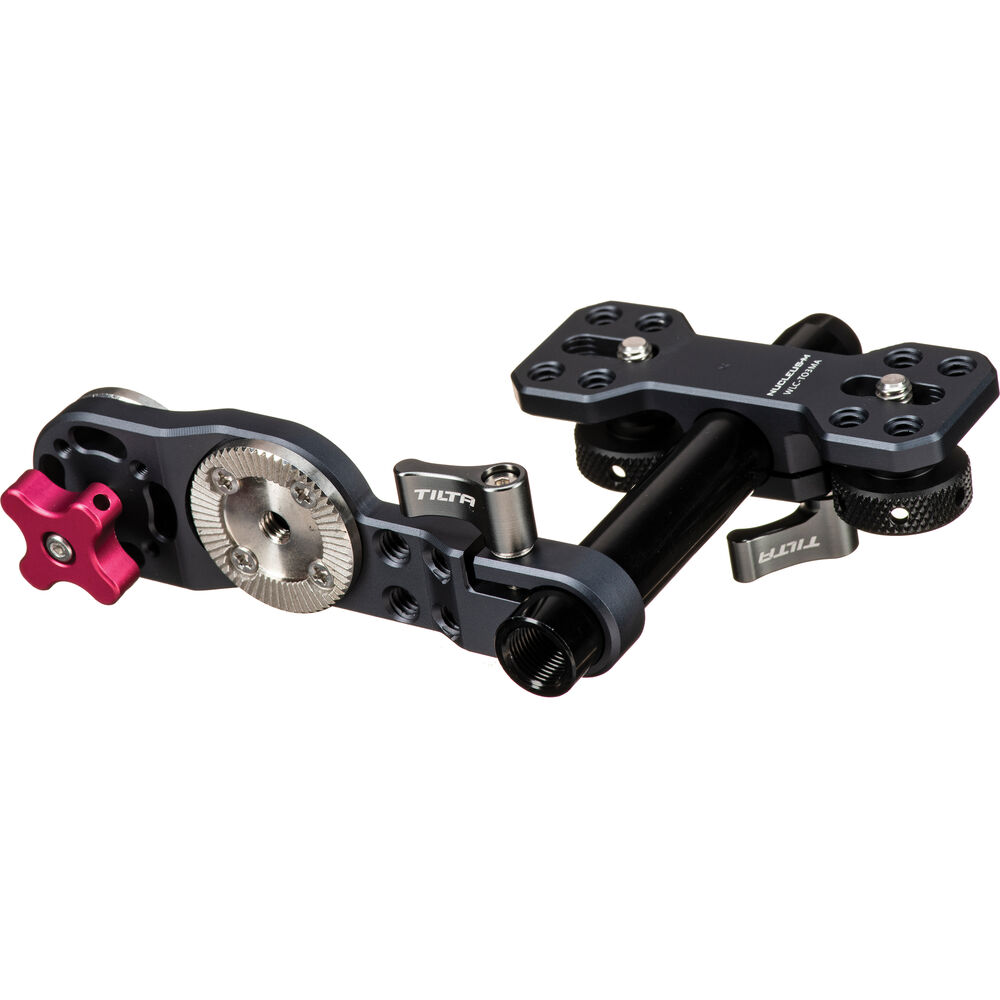 The other end of the bracket features a 15mm rod clamp that attaches to a 3.9" standard 15mm rod. The monitor plate attaches to the other end of the rod with its own 15mm rod clamp, and your monitor secures to the top of the plate with a thumbscrew, allowing easy tilt adjustment. The bracket also features one female rosette and four 1/4"-20 threads for attaching other accessories.