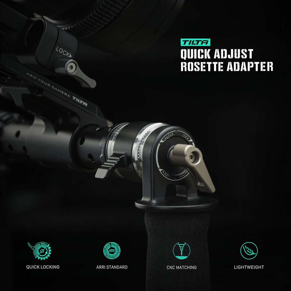 Integrate this Tilta Quick Adjust Rosette Adapter to the left-side of your Tilta rig or DJI gimbal rosette mount and convert your ARRI rosettes to quick-adjusting mounts. The adapter features dual mounts to attach to your rosette of your choice and compatible handle. An adjustment lever allows you to rotate your mounted handle without loosening any screws.