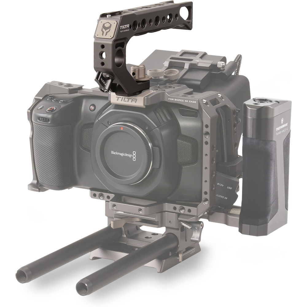 Carry and stabilize your Blackmagic Design Pocket Cinema Camera 4K with this lightweight Tilta gray Quick Release Top Handle from Tilta. The quick release handle's features include two shoe mounts, a 15mm rod port, multiple 1/4"-20 and 3/8"-16 threads, and a 3/8"-16 thread with locating pins.