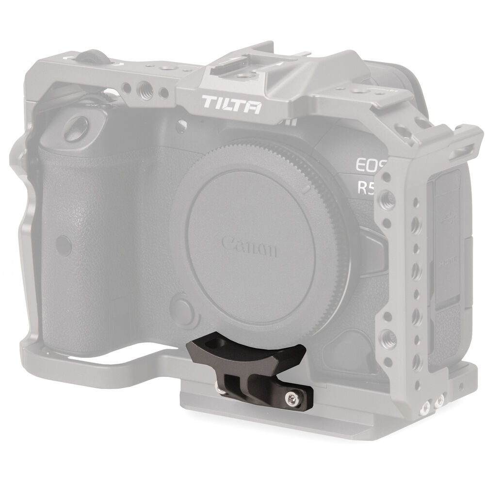 The RF Mount Adapter Support, in Tilta gray, attaches to the front of the Tilta camera cage for the Canon R5/R6 to provide support for an RF lens mount adapter. The attachment screw holes are slotted to allow a bit of vertical adjustment for compatibility with virtually all adapters.