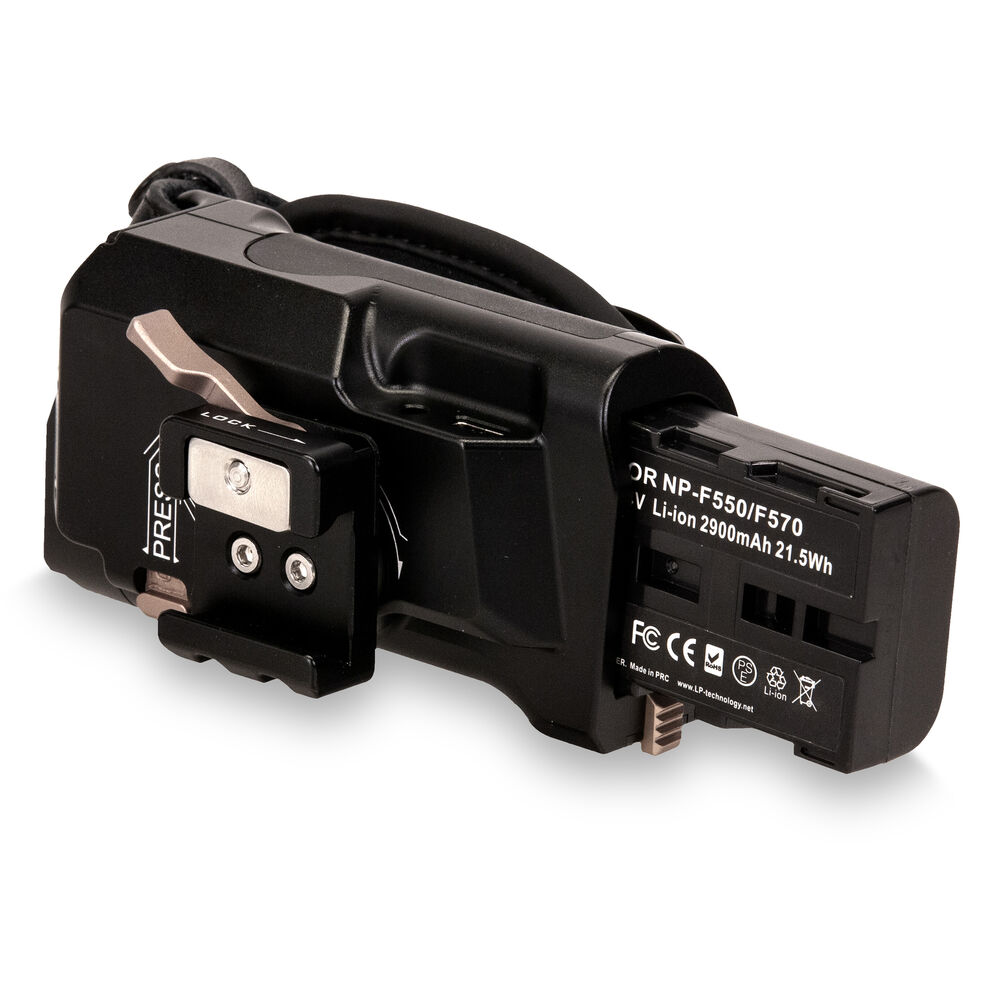 The handle attaches to the side of your Tiltaing cage using the included mounting arm, which features a NATO rail clamp. The handle accepts a Sony F570 battery, sold separately. There are two connections on the handle for powering accessories: an 8V regulated USB Type-C output and a 12 VDC output.