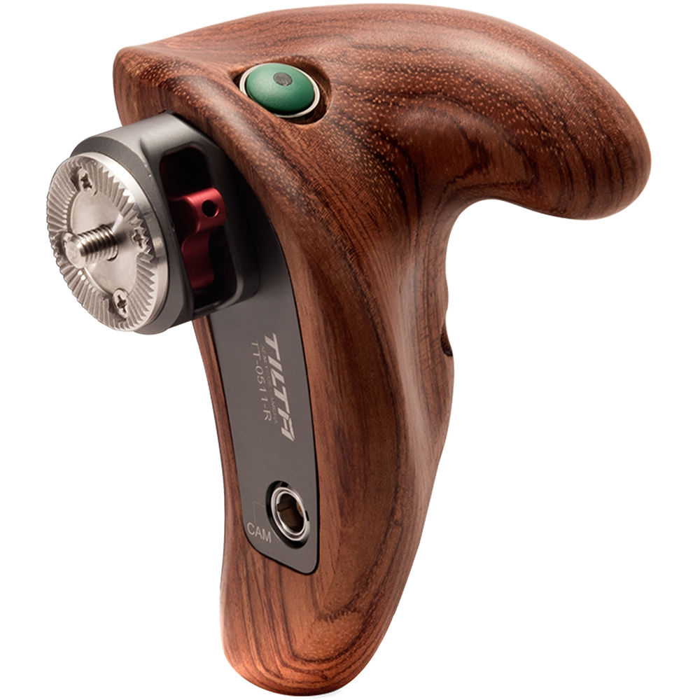 Use the Right-Side Wooden Handle 2.0 with Run/Stop Button from Tilta for extra support while operating your RED DSMC2 camera on a Tilta camera rig, a Gravity G2 or G2X gimbal, or a shoulder-mounted rig.