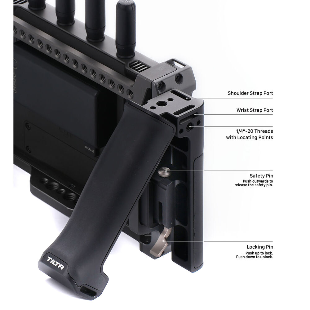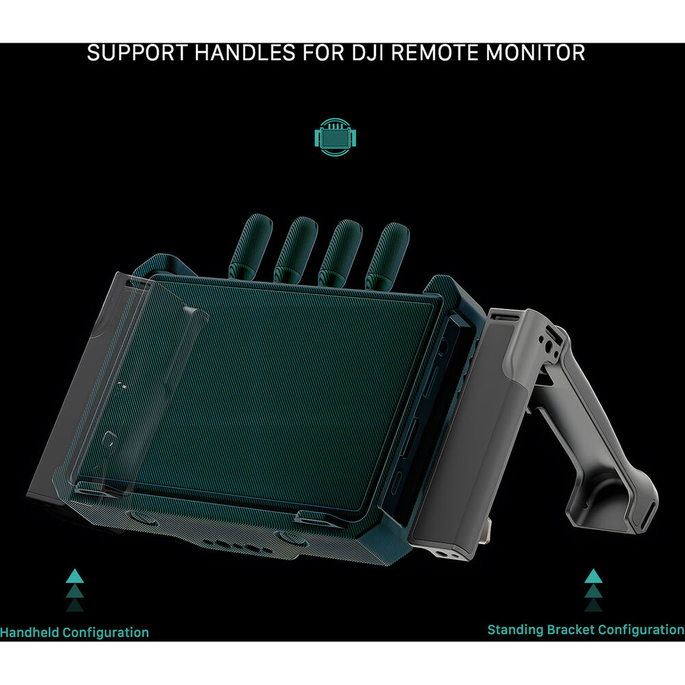 Add handles to your DJI 7" High-Bright Remote Monitor to create a handheld roaming director's monitor with this Support Handles Kit from Tilta. The handles mount onto the side of the monitor using the included mounting attachment with 1/4"-20 screws, and they provide stable handheld support on the right and left side of the monitor. They have an adjustment range of up to 1.3".