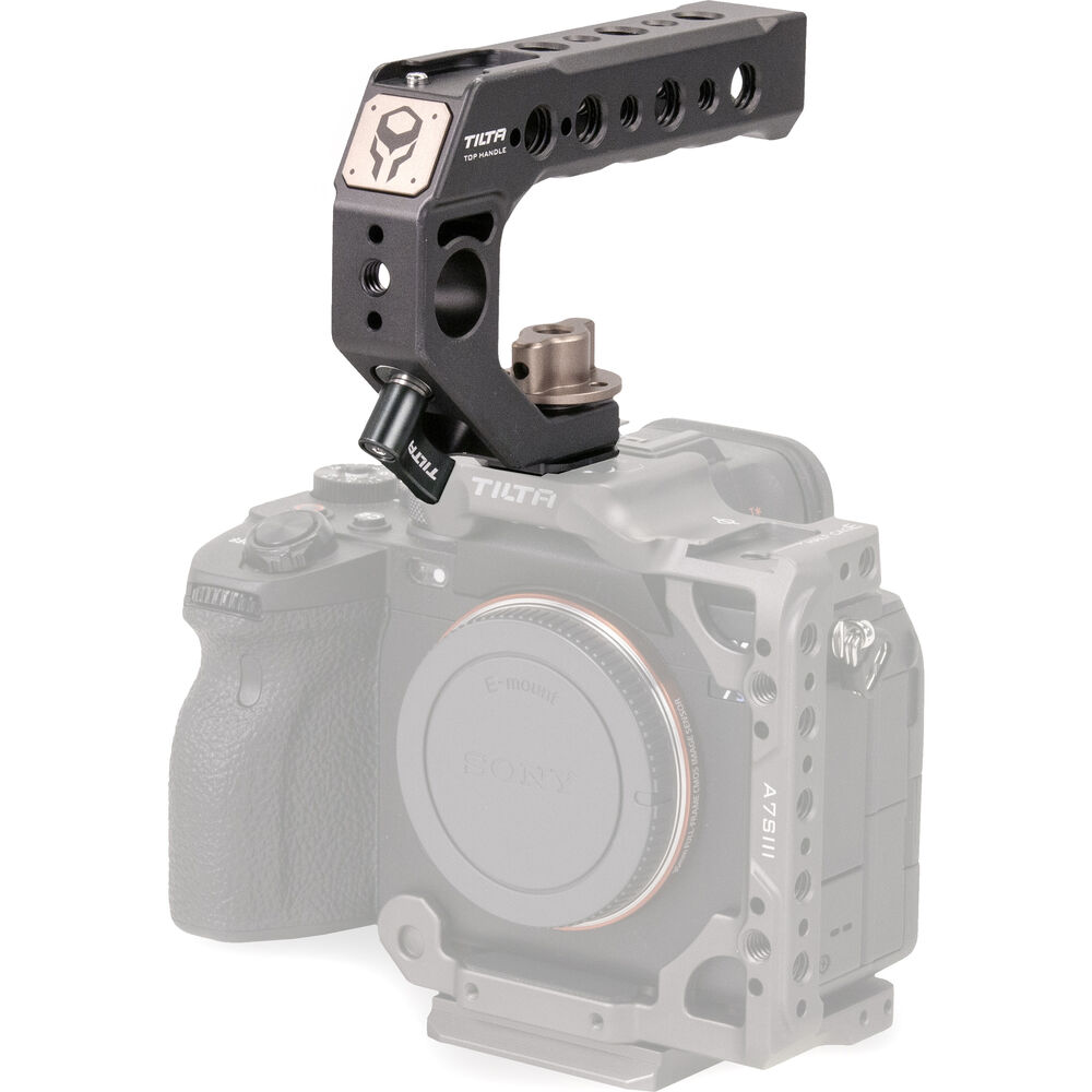 Carry and stabilize your Tiltaing camera cage with the Tilta gray Lightweight Quick Release Top Handle from Tilta. This quick release top handle is compatible with the Tiltaing Sigma fp full cage and Sony a7S III half cage. It features one shoe mount, a single 15mm rod port, and multiple 1/4"-20 and ARRI-style anti-twist 3/8"-16 threads.