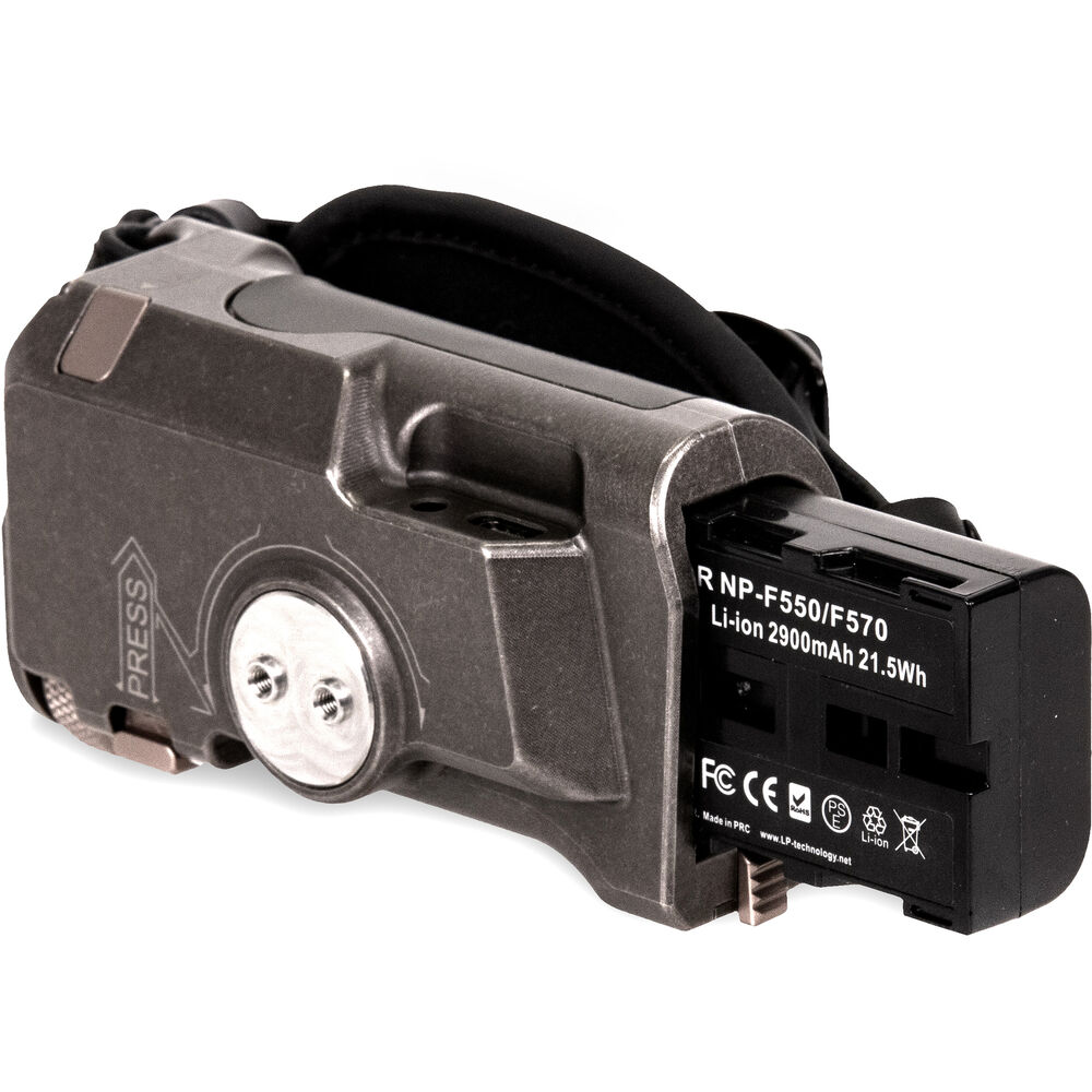 The handle accepts a Sony F570 battery, sold separately. An included USB cable connects the handle to your Nucleus Nano motor to power it off the F570 battery and to allow finger-wheel focus control.