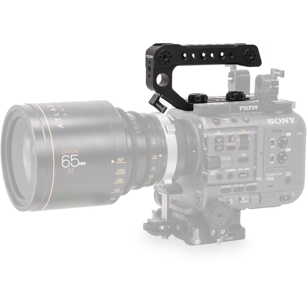 Mount this Tilta Top Handle for Sony FX6 on top of your camera in place of the original handle and reap the benefits of adjustable balance. In addition to multiple 1/4"-20 and 3/8"-16 threaded accessory mounting holes, the top handle features two cold shoes, two monitor mounts for the FX6 LCD monitor bracket, and a 15mm rod mount for attaching an EVF.