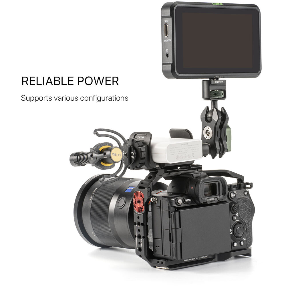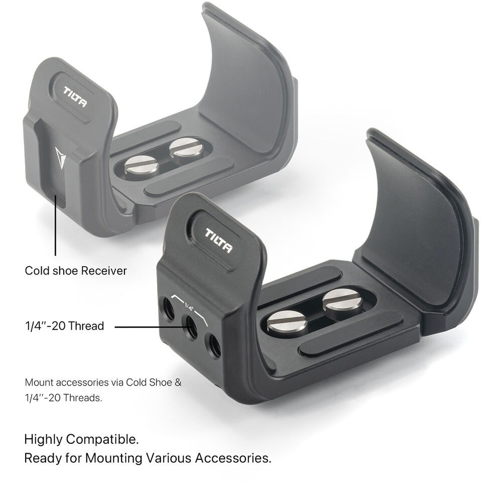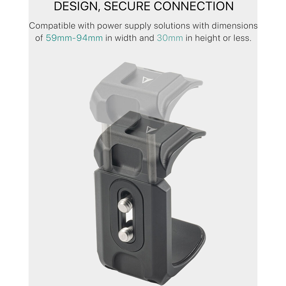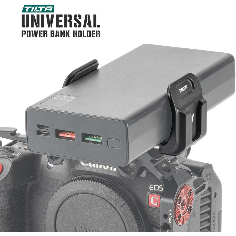 Mount any power bank measuring 2.3 to 3.7" wide and up to 1.2" in height to your camera rig using this black Universal Power Bank Holder from Tilta. The adjustable holder keeps your power bank in place securely during shooting and mounts to your camera cage or other rig via two integrated 1/4"-20 screws. The sturdy aluminum alloy piece features a cold shoe and 1/4"-20 threads for mounting accessories. The power bank holder comes with an Allen key for mounting convenience.