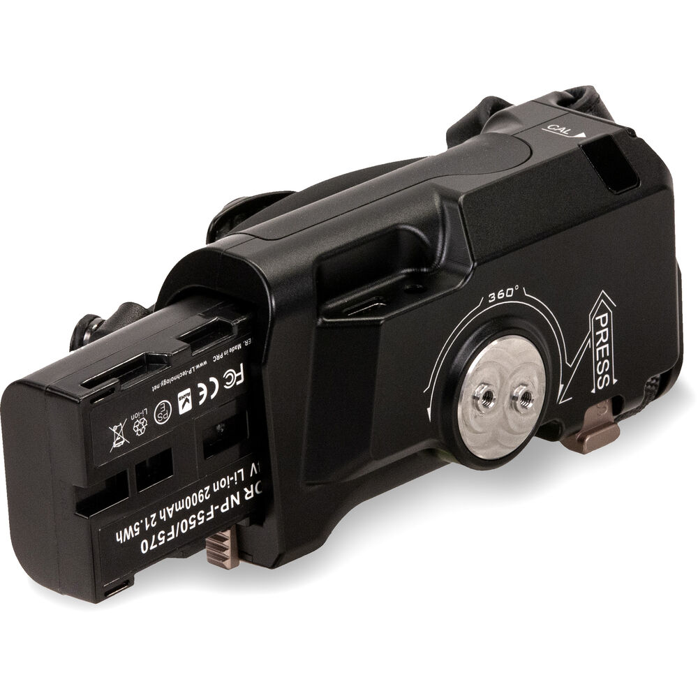 The handle accepts a Sony F570 battery, sold separately. An included USB cable connects the handle to your Nucleus Nano motor to power it off the F570 battery and to allow finger-wheel focus control.