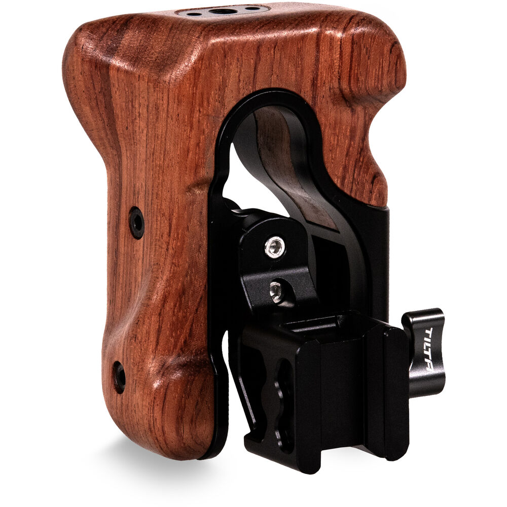 Style and comfort are the hallmarks of this type VI Tiltaing Left-Side Wooden Handle from Tilta, in a black aluminum finish. The grip is hand-carved from black walnut wood for an attractive, comfortable, and temperature-stable handgrip that is mounted on an aluminum alloy frame, providing support and strength for mounting accessories. It features a removable NATO rail clamp for attaching to cages, and optional brackets allow you an even wider choice of mounting options. The top of the handgrip features a 1/4"-20 threaded mounting hole in the aluminum frame, allowing you to attach a variety of accessories to your grip.