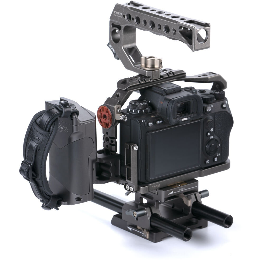 Add a basic rig to your Sony a1 mirrorless camera with this lightweight tactical gray Tiltaing Pro Camera Kit from Tilta. The kit includes a full camera cage, a cheese-style quick release top handle, an HDMI cable clamp, a power side handle with run/stop, a handle attachment mount, a 15mm LWS baseplate, two 7.9" long 15mm rods, a run/stop cable, and an HDMI extension cable.