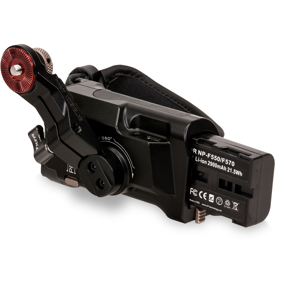 The handle attaches to the side of your Tiltaing cage using the included mounting arm, which features a mounting rosette. The handle accepts a Sony F570 battery, sold separately, and the two power output ports on the handle—an 8V regulated USB Type-C output where the USB cable plugs in and a 12 VDC output—allow you to power your accessories from the handle instead of drawing power from the battery powering your camera, preserving your camera's runtime.
