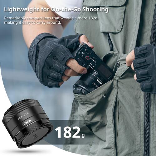 A compact, lightweight prime for Sony E-mount APS-C cameras, the 27mm f/2.8 AF Lens from Ulanzi offers a full-frame equivalent 40.5mm, normal-length field of view with a bright maximum aperture and autofocus capabilities. Well suited for portraits, landscapes, and street photography, the lens also has a minimum focus distance of 1' for use in close-up shooting. The lens has both manual and autofocus options and supports eye-recognition algorithms for both humans and animals. Its optical design features six elements in five groups, and the f/2.8 maximum aperture delivers low-light performance and shallow depth of field effects. The lens is lightweight at 6.4 oz and accepts 52mm filters. A USB-C port at the base of the lens enables users to directly upgrade the lens with the latest firmware.