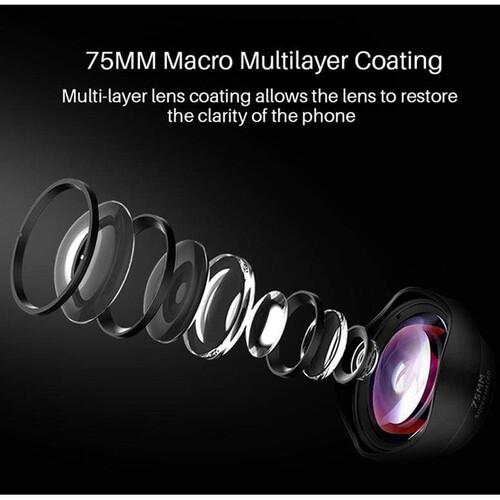 Made for detail-oriented creatives, the 75mm Macro Lens from Ulanzi lets you capture your world from a new perspective, especially for shots of insects and extreme close-ups. Its 75mm focal length delivers a magnification of 10x and a minimum focusing distance of 1.57". Also featured is a 5 element, 4 group design, and a multi-layer lens coating. Built using alloy and optical glass, Ulanzi designed this lens to be compatible with most smartphones. An integrated metal lens clip helps ensure secure phones to lens attachments and included is a carrying case.