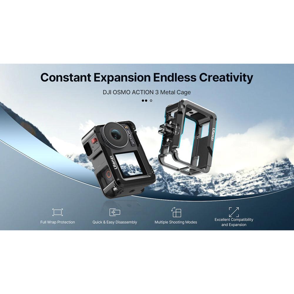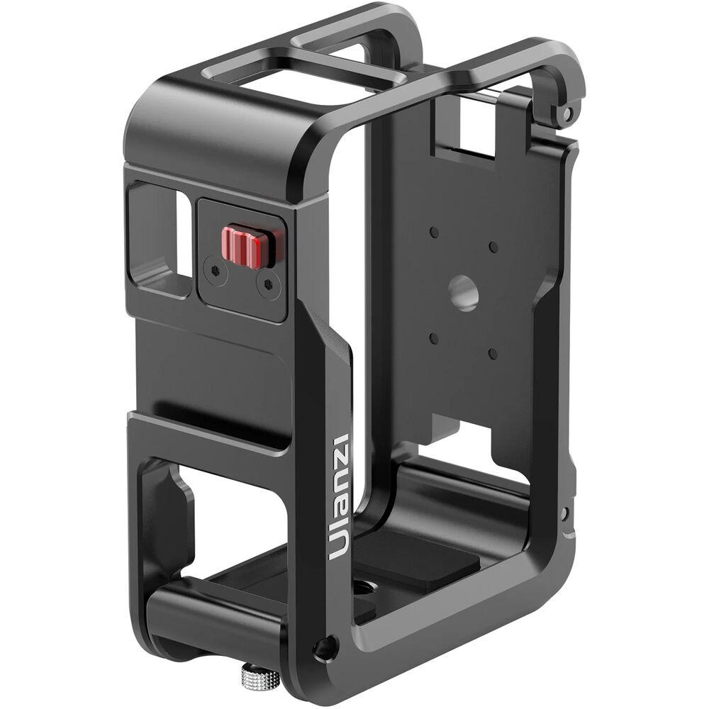 Add accessories to and protect your DJI Osmo Action 4 or 3 action camera with this durable Camera Cage from Ulanzi. The cage is designed to protect your camera and can also be used to add accessories via its shoe mount and 1/4"-20 threads. The cage mounts easily using a slide-in design and allows you to access all ports, controls, battery door, and the lens to add and remove optional lenses and filter adapters.