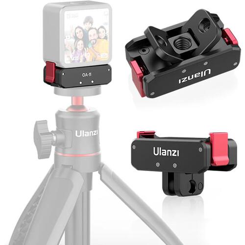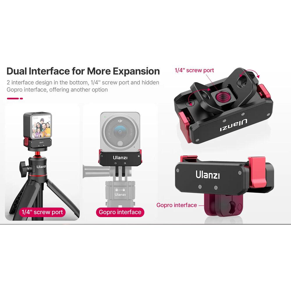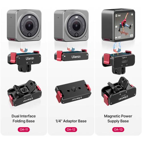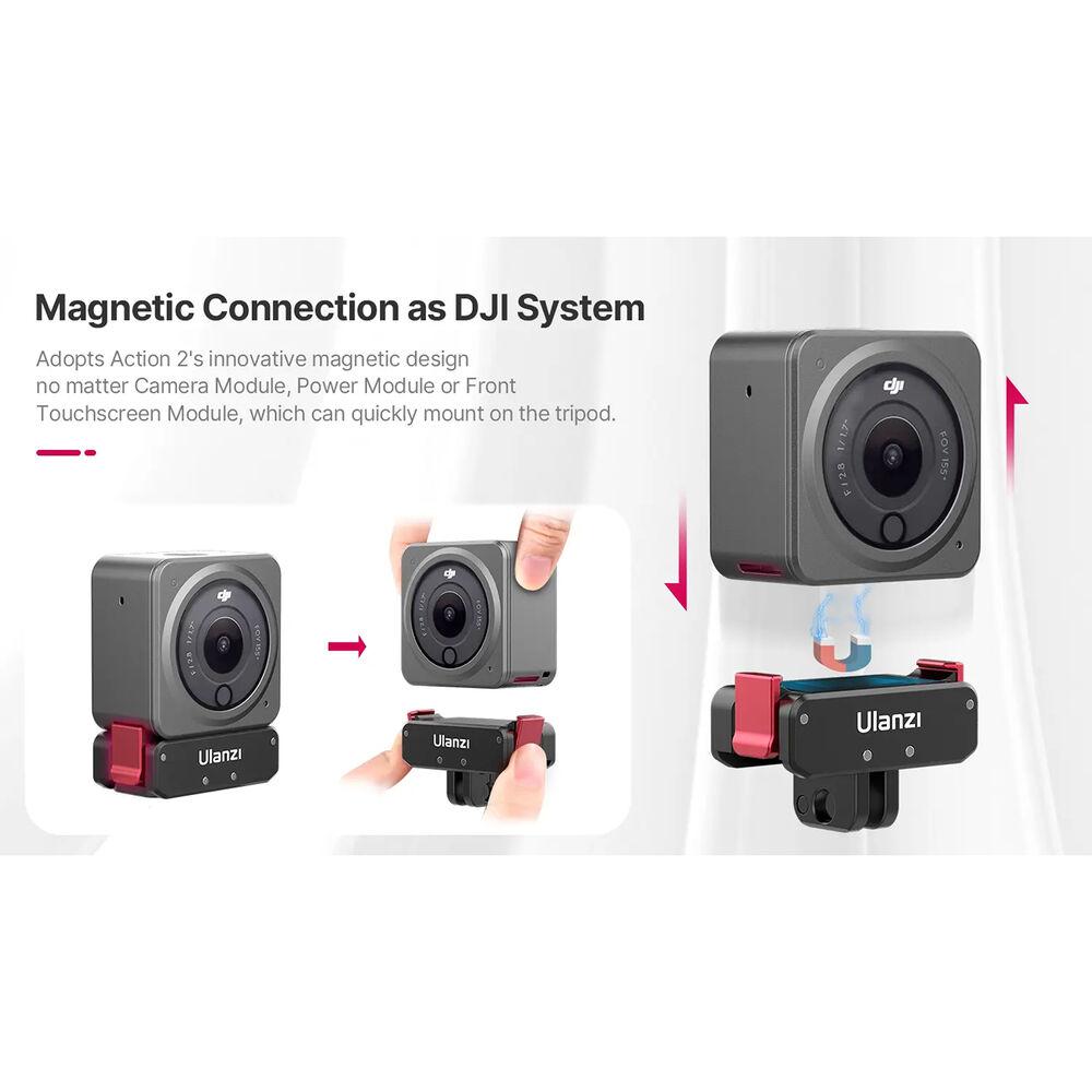 The Dual-Interface Folding Base for DJI Action 2 from Ulanzi provides versatile mounting for your DJI Action camera. This 2-prong aluminum alloy adapter mounts on your camera using its magnetic base and two clips. It has a 3-prong base interface and folds to provide a 1/4"-20 thread for mounting on an articulated arm, tripod, or another support.