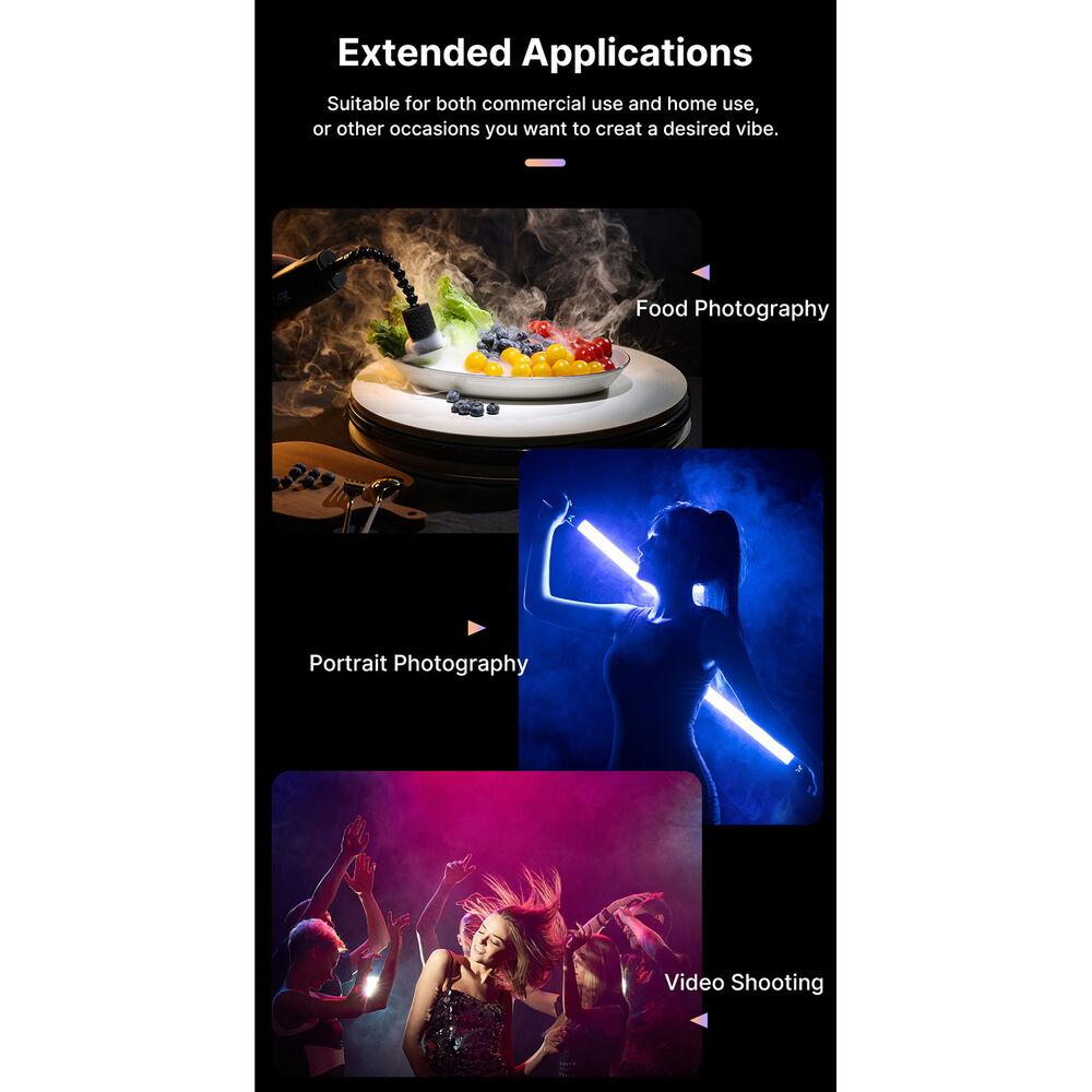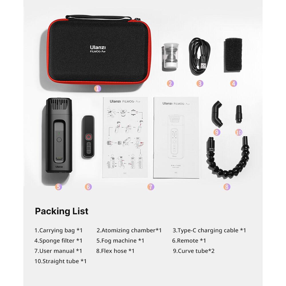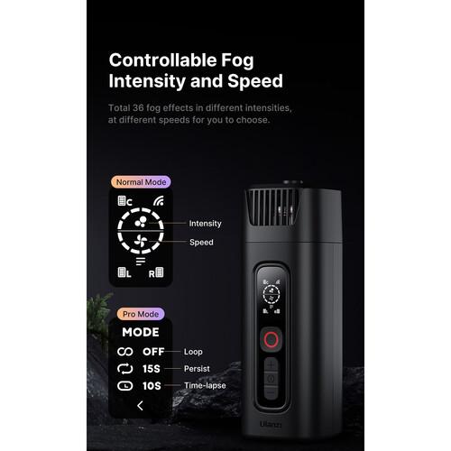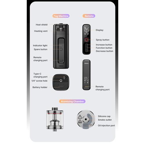 Add a foggy atmosphere to your photography, events, or stage with the handheld FM01 FILMOG Ace Portable Fog Machine from Ulanzi. This highly portable fog machine suits multiple scenarios, such as parties or weddings. The oil tank capacity is 8mL. Manually release fog or use the supplied remote control for convenient use from a distance. The kit includes a remote control, an atomizing chamber, other accessories, and a protective case that holds everything. This version comes without the necessary fog juice and batteries.