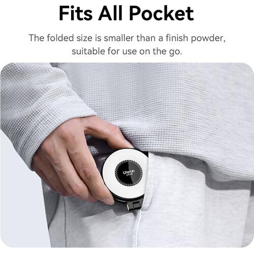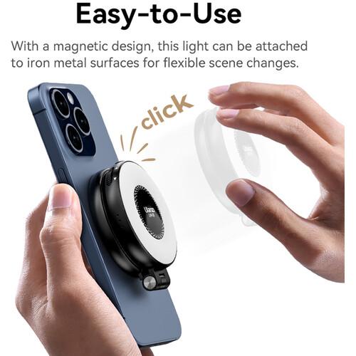 Enhance the lighting in your videos and selfies using the black LM19 MagSafe LED Selfie Ring Light from Ulanzi. It attaches to compatible devices using a MagSafe mount or the included magnetic ring sticker and may be flipped for use with both front and rear cameras. It features an adjustable color temperature of 2800 to 8500K, plus adjustable brightness from 10 to 100% with stepless dimming. With a beam angle of 120°, this light will improve photos and videos taken in low light, or add fill light to content captured under more normal conditions. Its 400mAh battery lasts for around 1.5 hours at full brightness or 8 hours at minimum brightness and can be recharged in 90 minutes using an integrated USB-C port.