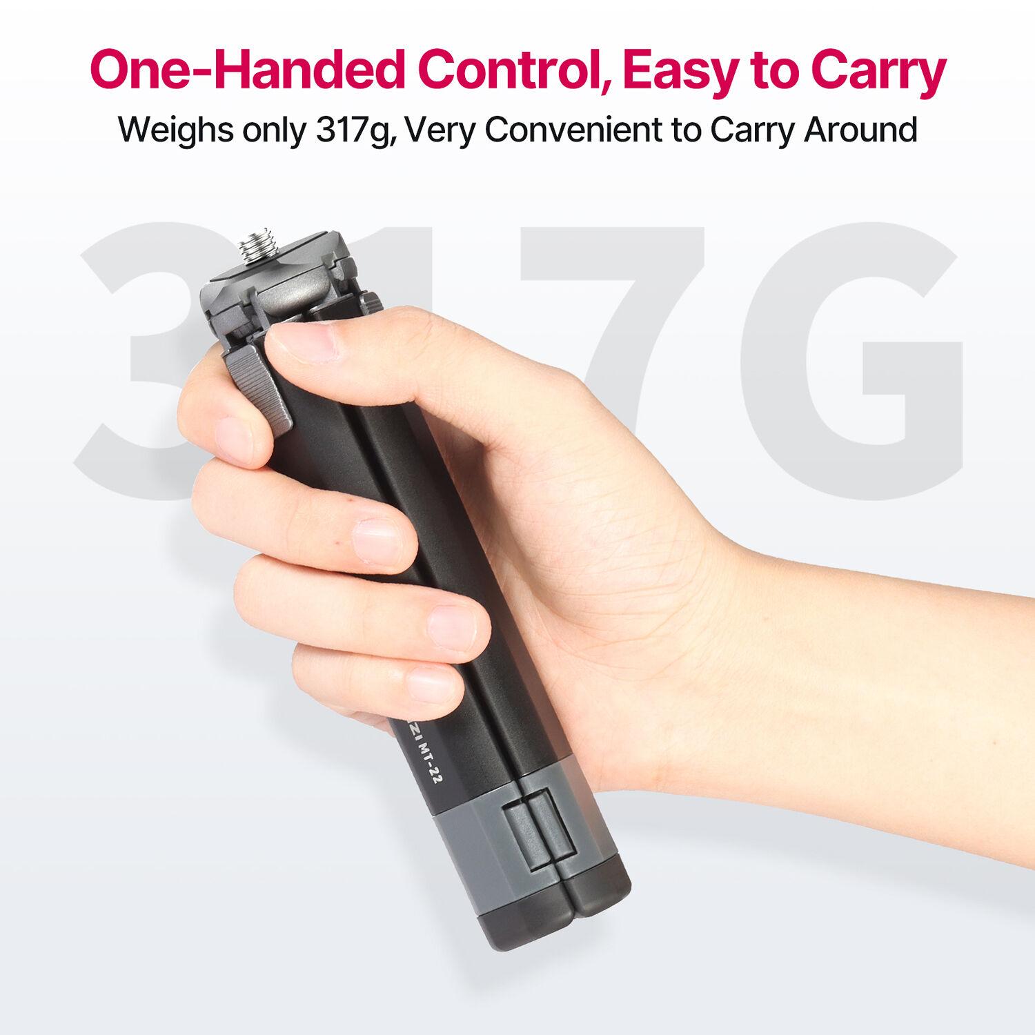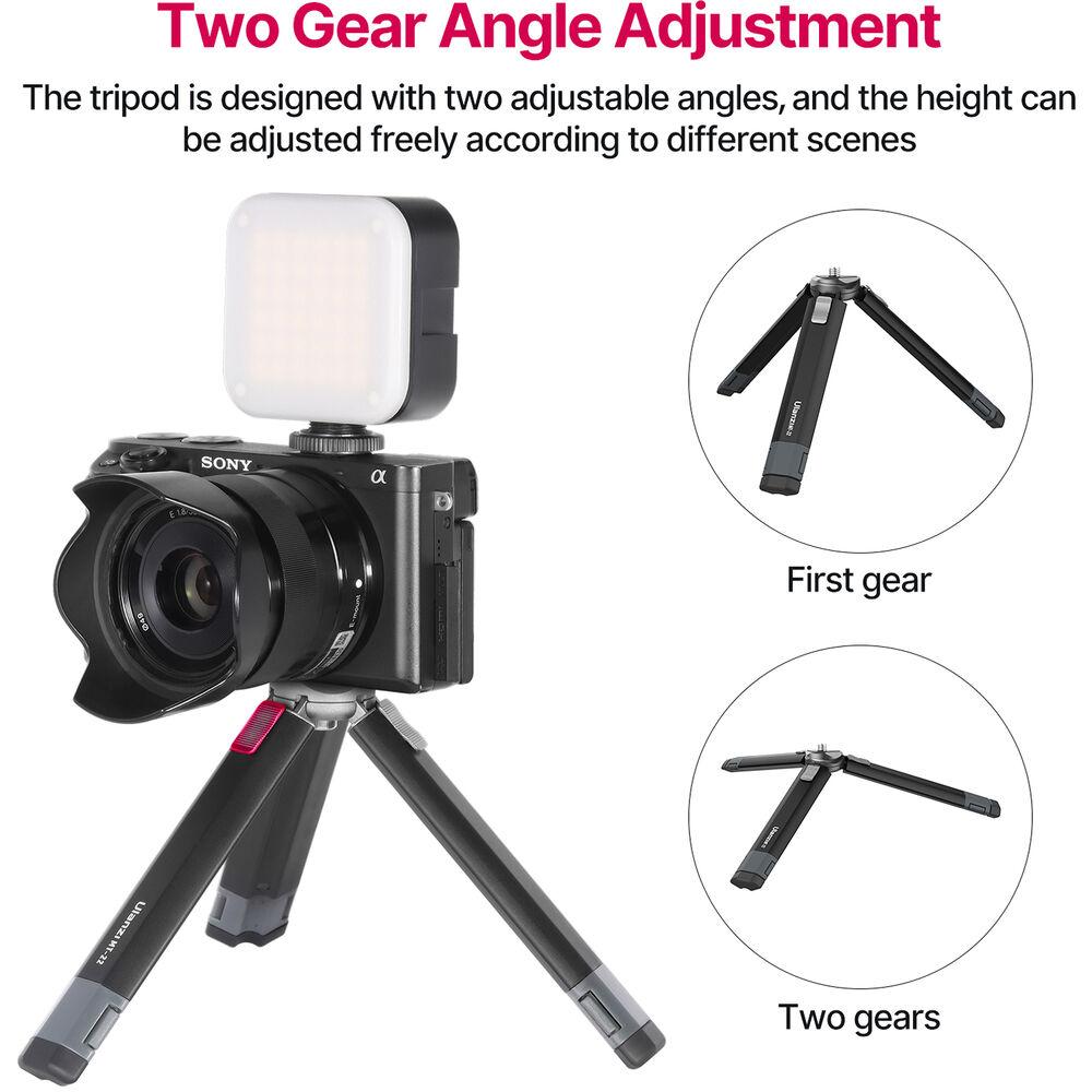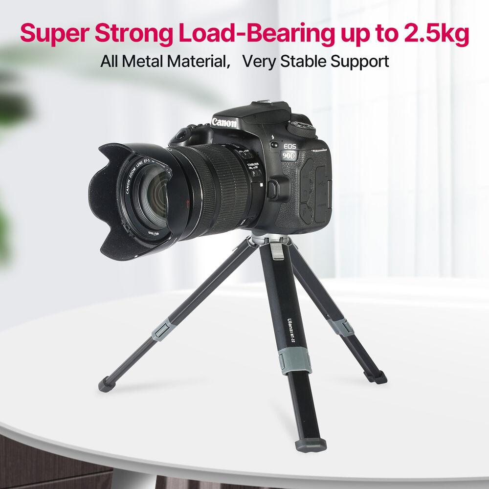 The MT-22 Metal Mini Tripod from Ulanzi is a compact and portable all-metal tripod that has a load capacity of 5.5 lb, making it an ideal support for compact mirrorless cameras, webcams, action cams, and more. The two-section legs expand quickly thanks to durable push-pull locking joints. The MT-22 offers independent leg spread and two leg height positions, a normal height for most applications plus a low-perspective height for macro imaging. This compact tripod folds up to less than 4" long and fits easily into a bag or pocket.