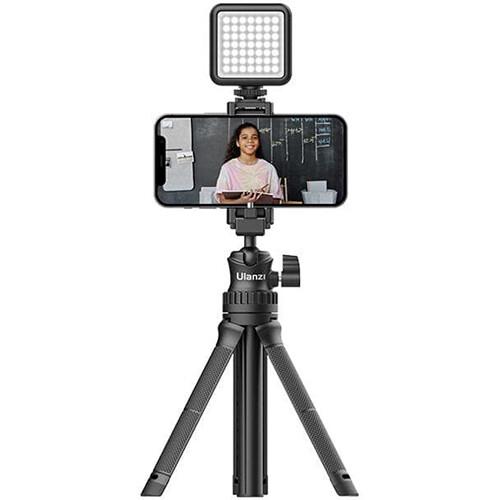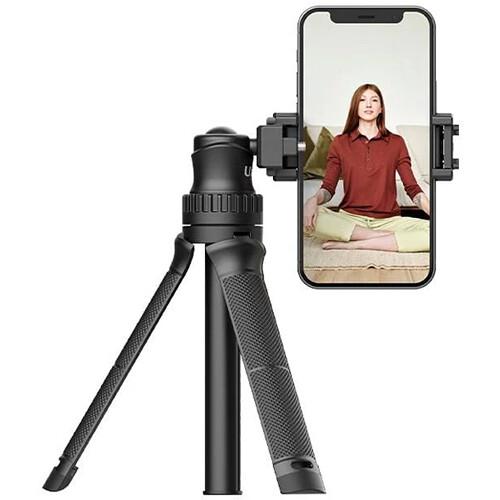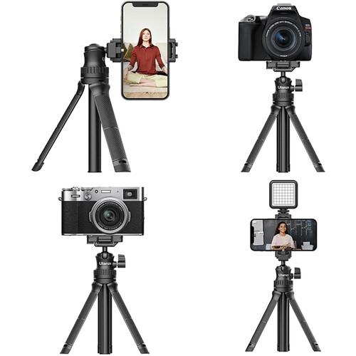The MT-34 Multifunctional Tripod with Ball Head from Ulzani is a compact and lightweight tripod that converts into a selfie stick, offering a variety of webcasting options. It has a maximum height of 32.1" and a load capacity of 3.3 lb. The legs can be folded to form a large, comfortable camera grip for the center column that extends into a long selfie stick. The integrated ball head has a standard 1/4"-20 mounting screw and also features a folding smartphone clamp that can hold phones from 2.3 to 3.9" wide.