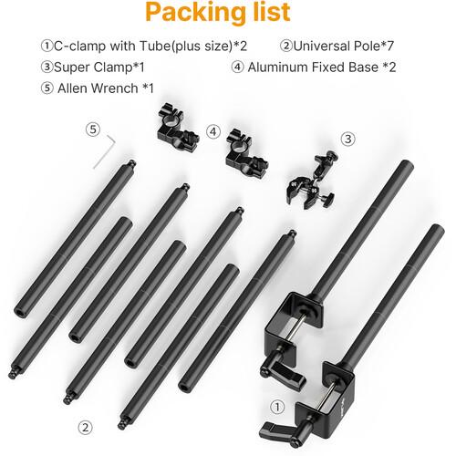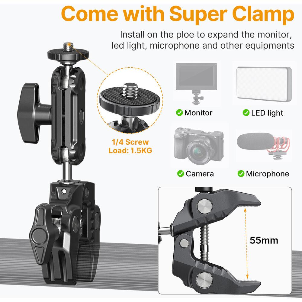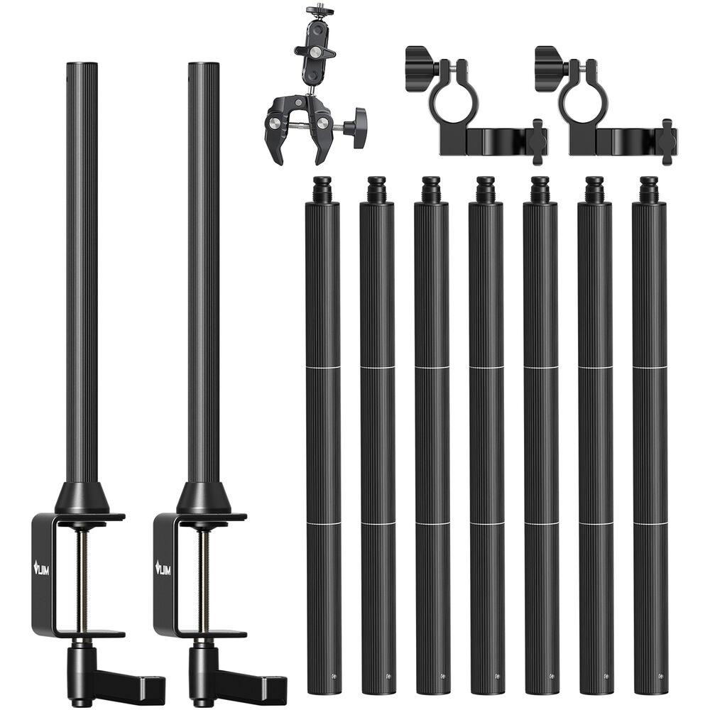 Turn your desk into a functioning DIY studio for vlogging, livestreaming, or product photography with the Multifunction Photo Studio Stand from Ulanzi, which can carry up to 22 lb of equipment and features an adjustable, segmented design. The aluminum alloy rods are corrugated for increased resistance, preventing slipping and ensuring the equipment's stability. The c-clamps mount to ledges at a width of up to 90mm and an additional Super Clamp secures and extends the position of monitors, LED lights, microphones, and other equipment.