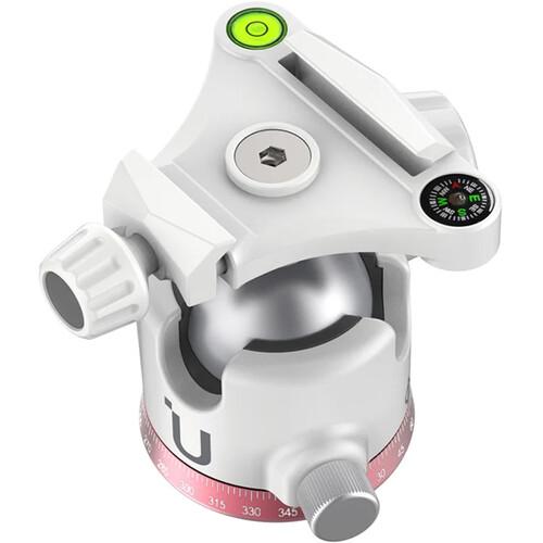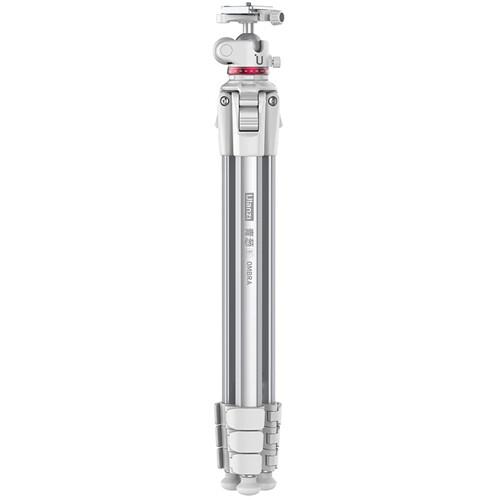 The white Ombra Aluminum Travel Tripod with Ball Head from Ulanzi is a lightweight and versatile travel tripod with a load capacity of 17.6 lb and a maximum height of 62.2". It has a faceted leg design and a triangular center column providing a compact profile of about 2", making it easy to store and transport. The center column is removable and reversible for low-perspective camera positioning and macro photography. Each leg is made of aluminum and has a removable foot that exposes a spike for traction on any surface. The ball head has two notches to easily change from portrait to landscape orientation. An included Arca-type quick release plate mounts securely in a clamp with a bubble level and a mini-compass for precise orientation. The Ombra tripod also includes an adjustable smartphone holder, which makes it an ideal tripod for everything from webcasting to shooting TikTok videos.