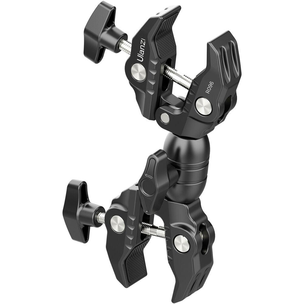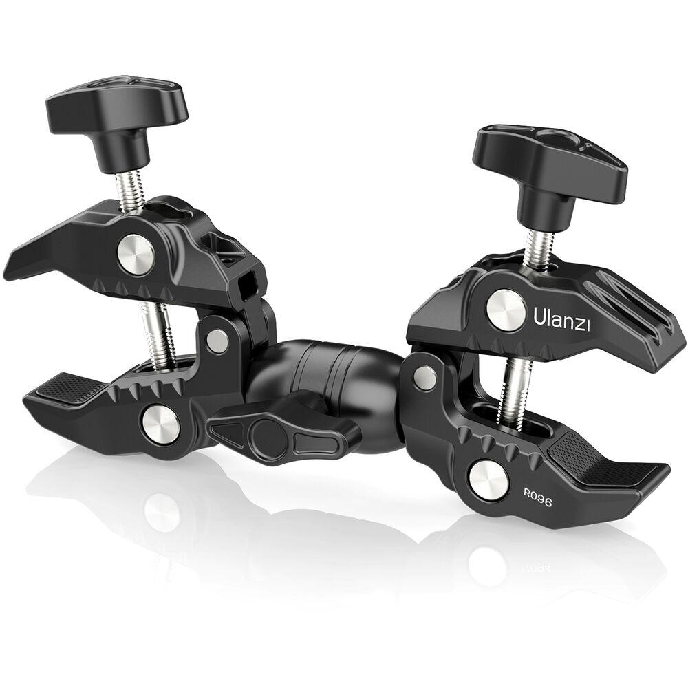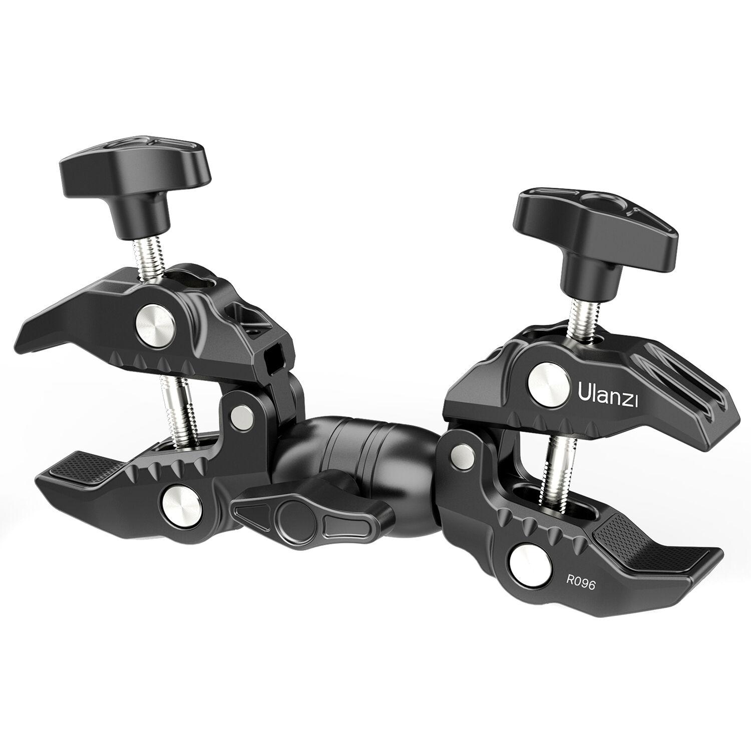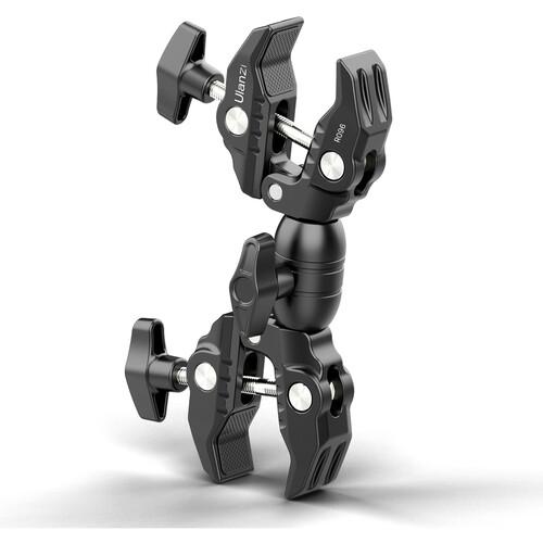 The R096 Double Super Clamp from Ulanzi consists of two clamps joined by a center post. Each clamp can rotate 360° and features a 0.5 to 2.3" opening range and nonslip silicone pads to protect the gripped surface or component. This double clamp supports up to 3.3 lb and can be used to attach a selfie stick, an umbrella, or another component to a rail, table, or another surface.