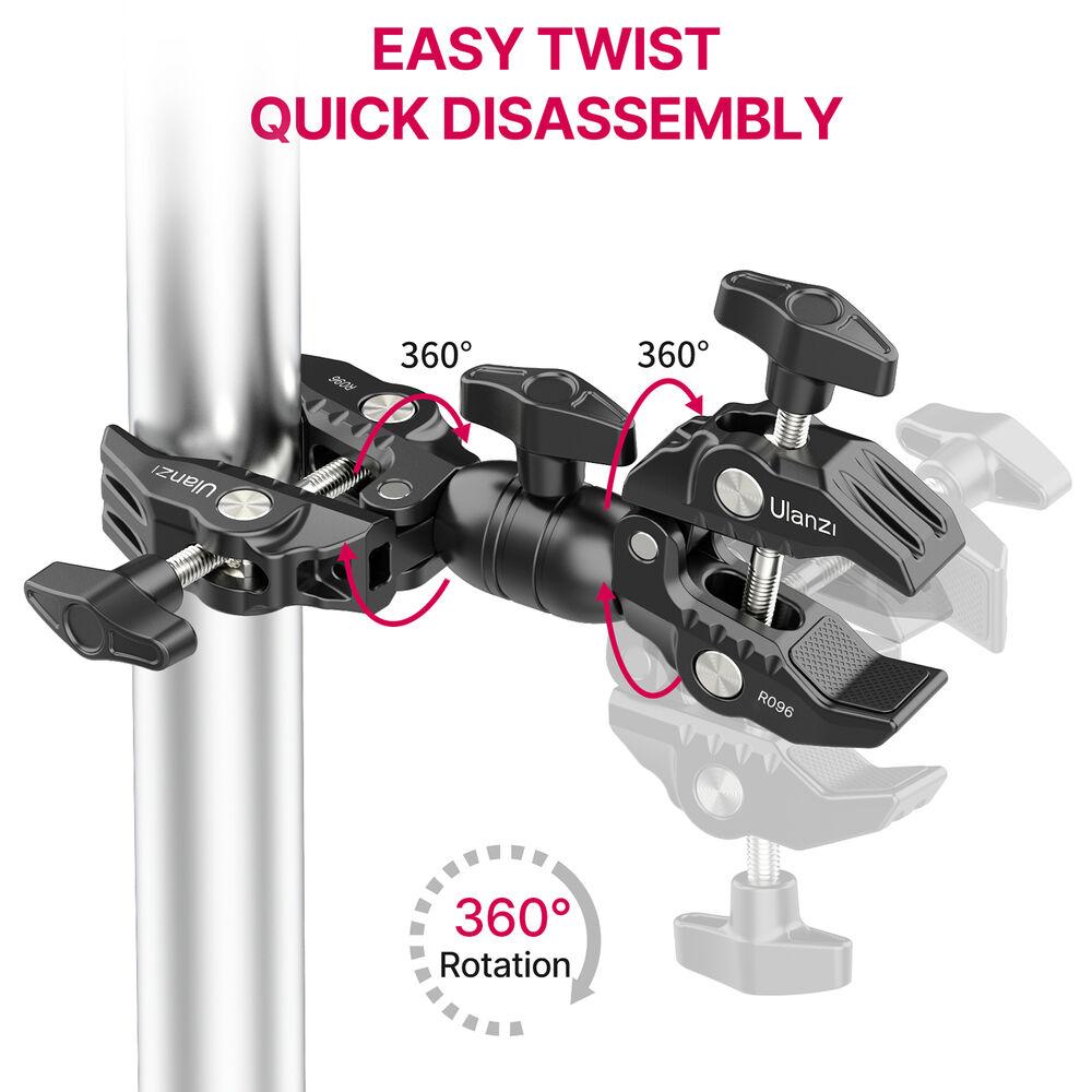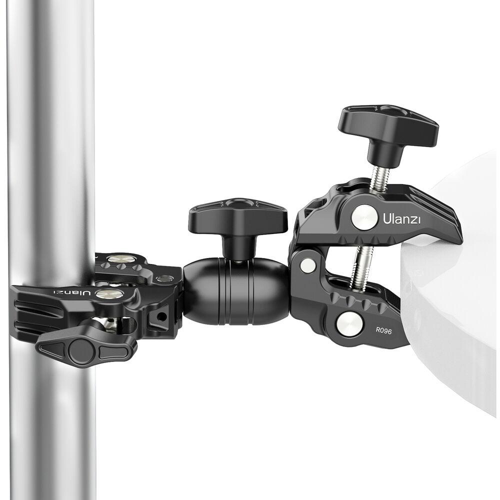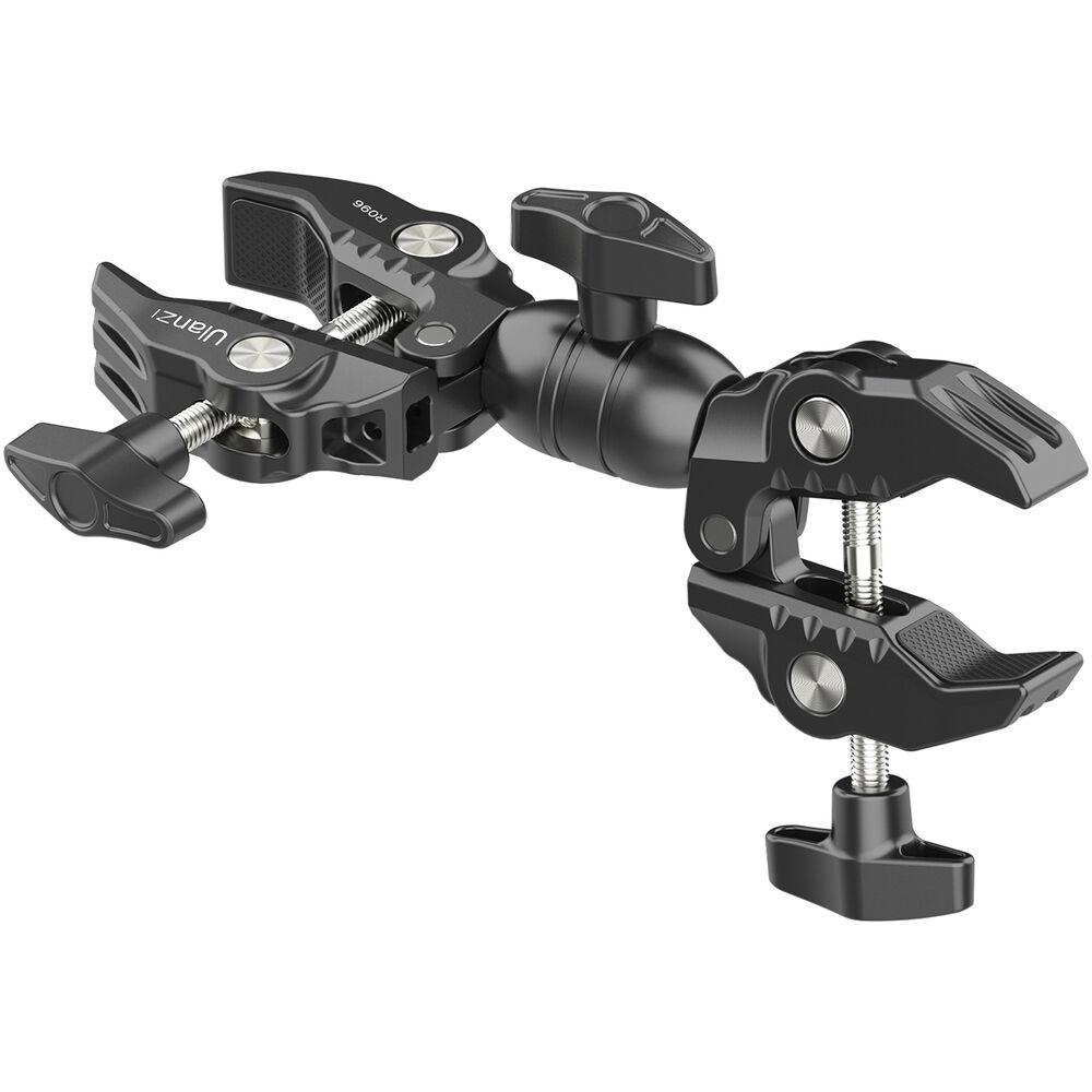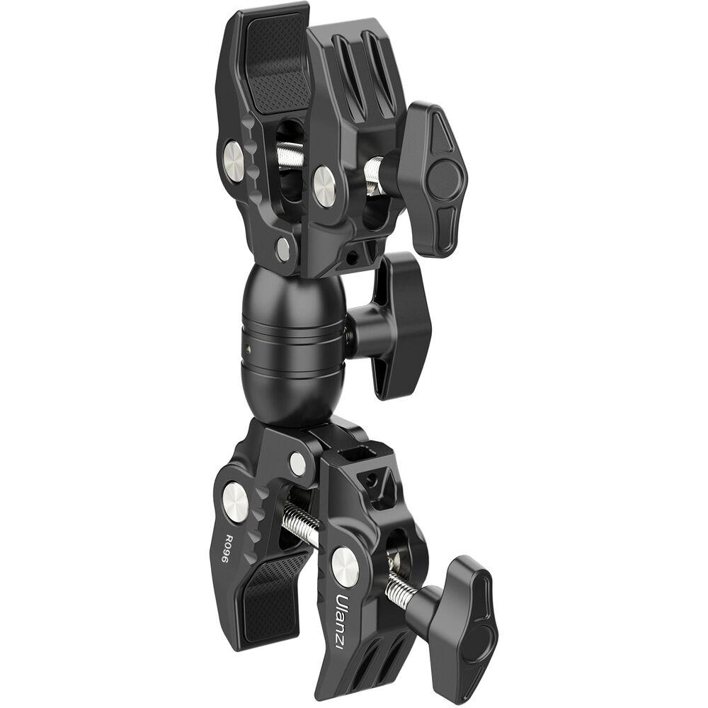 The R096 Double Super Clamp from Ulanzi consists of two clamps joined by a center post. Each clamp can rotate 360° and features a 0.5 to 2.3" opening range and nonslip silicone pads to protect the gripped surface or component. This double clamp supports up to 3.3 lb and can be used to attach a selfie stick, an umbrella, or another component to a rail, table, or another surface.