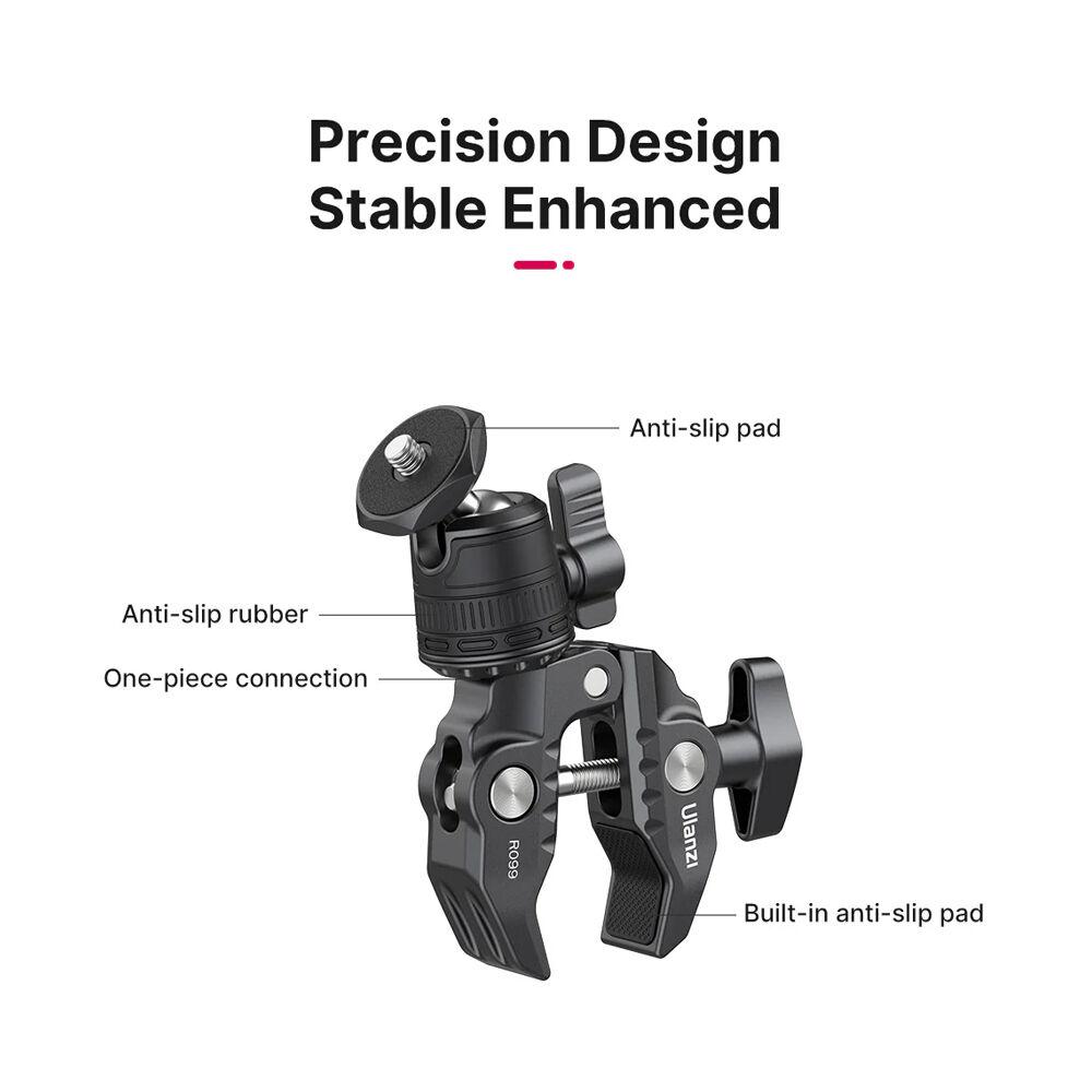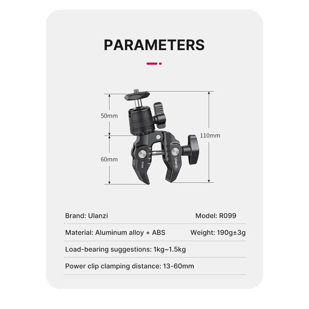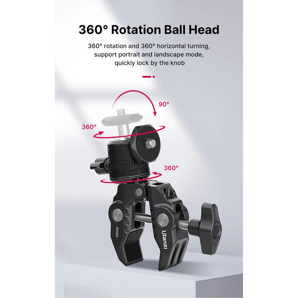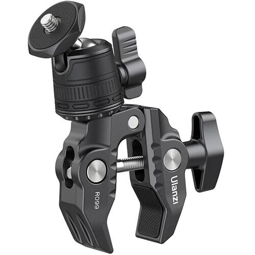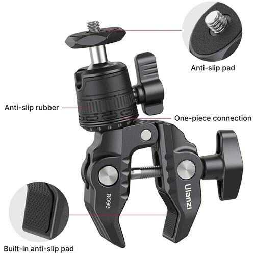 Mount your camera, monitor, LED light, or other accessory onto a variety of surfaces using the R099 Super Clamp with Mini Ball Head from Ulanzi. Made from an aluminum alloy, ABS plastic, and rubber padding, the clamp supports loads up to 3.3 lb using a 1/4"-20 screw. The clamp can be used with surfaces ranging from 0.5 to 2.4" deep, and the ball head provides 360° pan and 180° tilt.