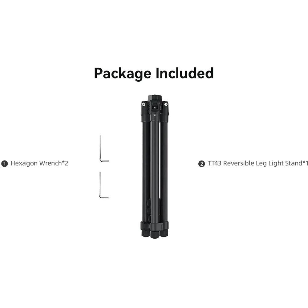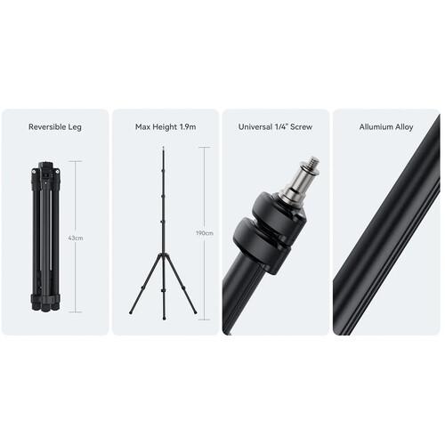 The Reversible Leg Light Stand from Ulanzi is a compact and portable support solution for photographers on the go, such as those shooting outdoor portraits or in tight spaces like home studios. It weighs only 1.8 lb and folds down to just 16.9" while maintaining a maximum load capacity of 13.2 lb and height range from 17.7 to 74.8", thanks partly to its aluminum alloy construction and flip lock design on the legs and center column. Additional features like rubber non-slip feet and a ballast hook help with extra security when your stand is set up, and a 1/4"-20 mounting screw makes it widely compatible with a diverse range of lights and equipment. Independent 3-angle leg locks help you find the ideal position for your stand, regardless of uneven ground.