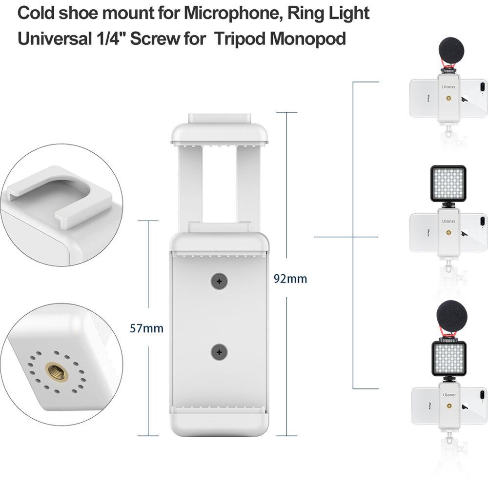Elevate your mobile photography by combining this Ulanzi ST-07 Phone Mount with Cold Shoe and an optional tripod or selfie stick. The holder gives you a stable platform for capturing landscape photos and video. It screws onto a tripod with a standard female 1/4"-20 threaded connection. The phone clamp opens to accept devices from 2.2 to 3.6" in width, and built-in rubber grips help to secure the phone in place and protect it from scratches. To further enhance your content, you can use the top cold shoe with an optional accessory, such as an external microphone or LED light.