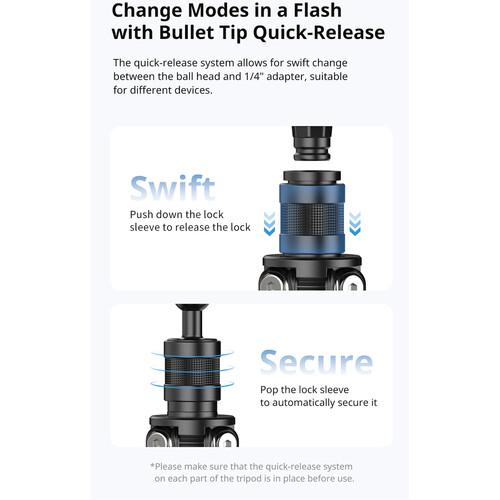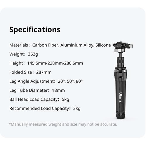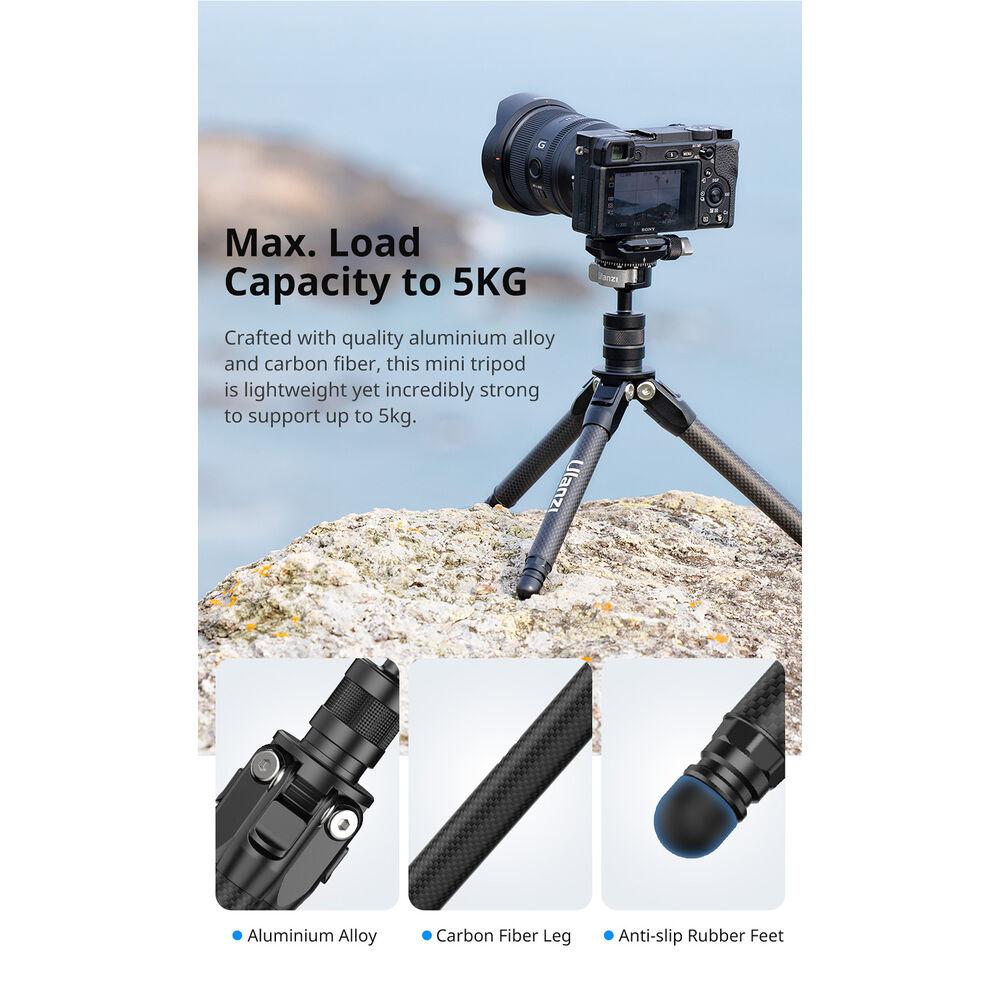 The TT35 Mini Tripod with Ball Head is part of Ulanzi's TT35 modular tripod system. This mini tripod features a load capacity of 11 lb, a maximum height of 11.3", and a minimum height of 5.7". Not shy on versatility, you can fold the tripod's legs in and use it as an on-the-go vlogging tool. Made of sturdy carbon fiber, aluminum alloy, and silicone, the TT35 mini tripod is supplied with a 360° ball head and a 1/4"-20 adapter to suit different devices.