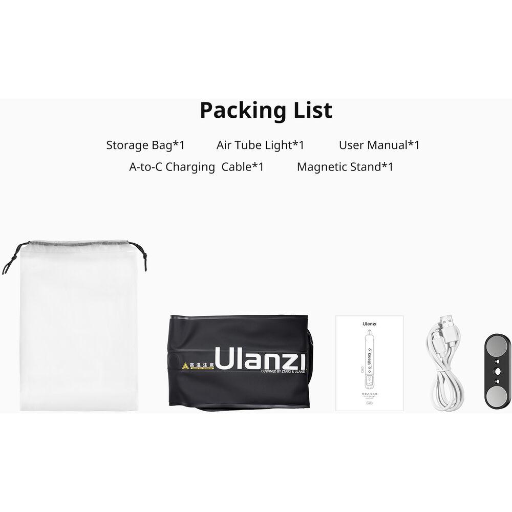 Create soft lighting anywhere with the inflatable UA12 Portable Air Tube Light from Ulanzi. Ideal for content creators, filmmakers, and photographers seeking a versatile light source, this bi-color LED provides an adjustable color temperature range from 2700 to 6500K with a CRI rating of 95. A built-in 2500mAh battery powers the light for 75 minutes at 100% brightness and recharges in approximately two hours via USB-C. Twelve lighting effects create unique outputs, including strobe, lightning, and flashing. Built-in N52 magnets allow for easy attachment to most metal surfaces.