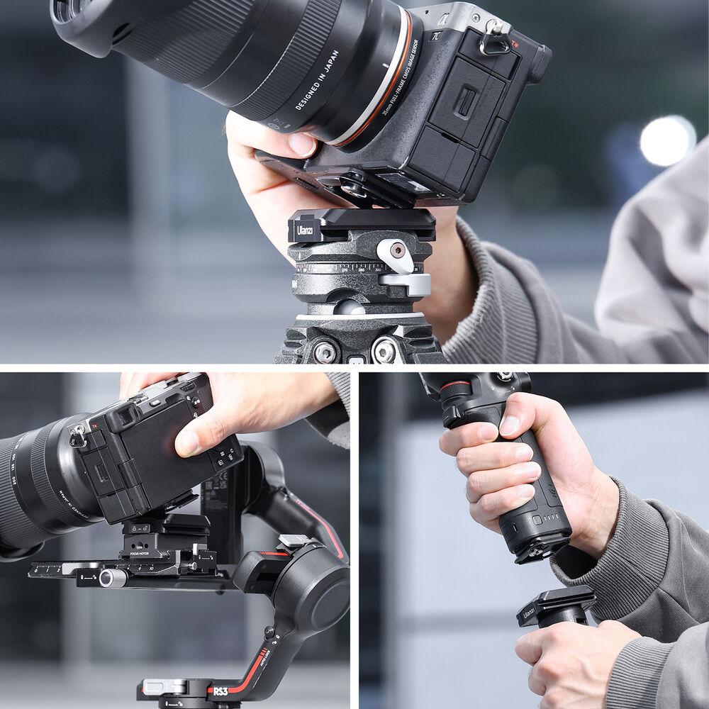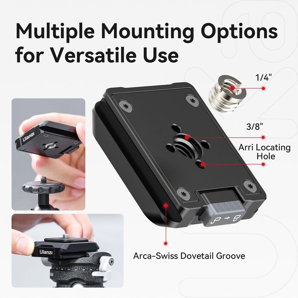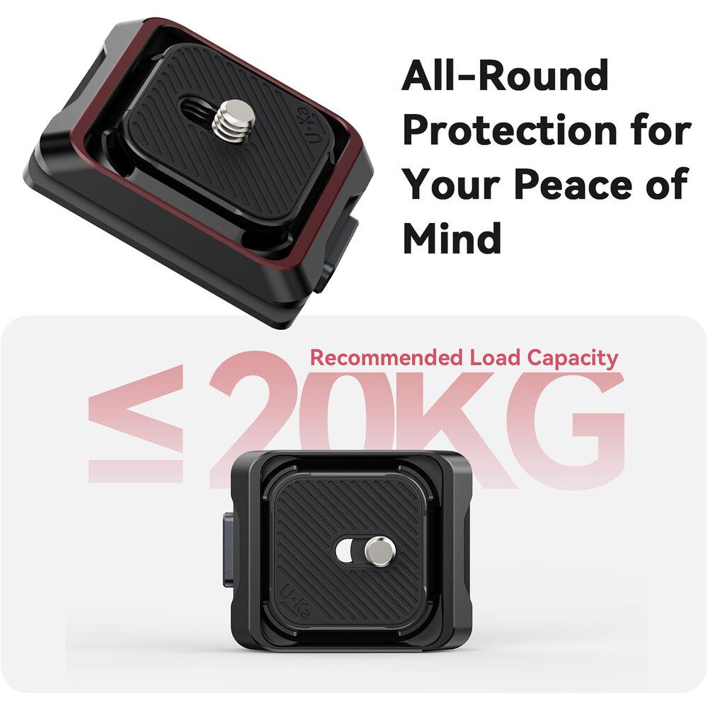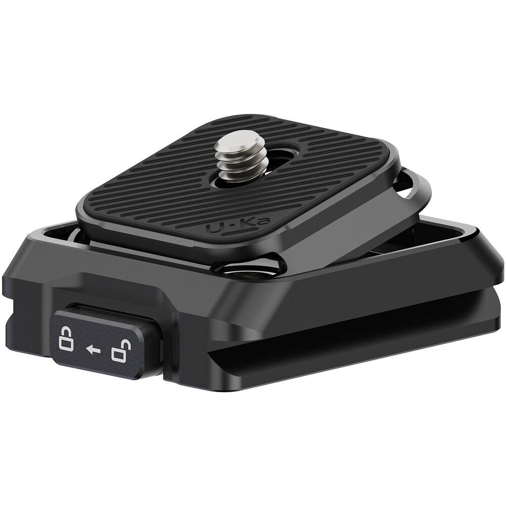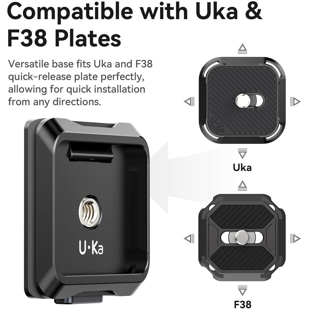 This Uka Quick Release Plate & Base Kit from Ulanzi secures your camera while simplifying setup and breakdown, offering compatibility with the UKA and F38 baseplates. With a load capacity of 44 lb, this versatile accessory is Arca-type compatible and features a security lock button to prevent accidental detachment. It easily installs with a one-step, press-and-click mechanism. Also featuring 1/4"-20 and 3/8"-16 threaded holes and ARRI-type locating holes, this piece is compatible with various devices and accessories. The aluminum alloy, stainless steel, and silicone construction makes the kit lightweight and durable.